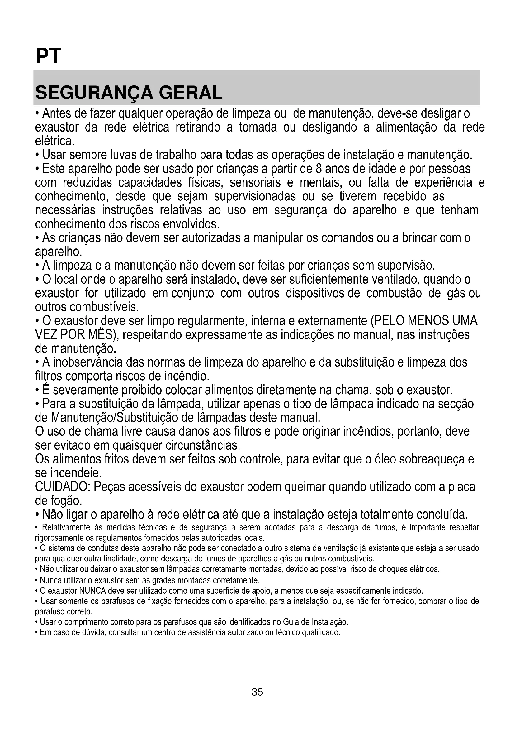- Para a substituição da lâmpada, utilizar apenas o tipo de lâmpada indicado na secção de Manutenção/Substituição de lâmpadas deste manual. O uso de chama livre causa danos aos filtros e pode originar incêndios, portanto, deve ser evitado em quaisquer circunstâncias. Os alimentos fritos devem ser feitos sob controle, para evitar que o óleo sobreaqueça e se incendeie. CUIDADO: Peças acessíveis do exaustor podem queimar quando utilizado com a placa de fogão.