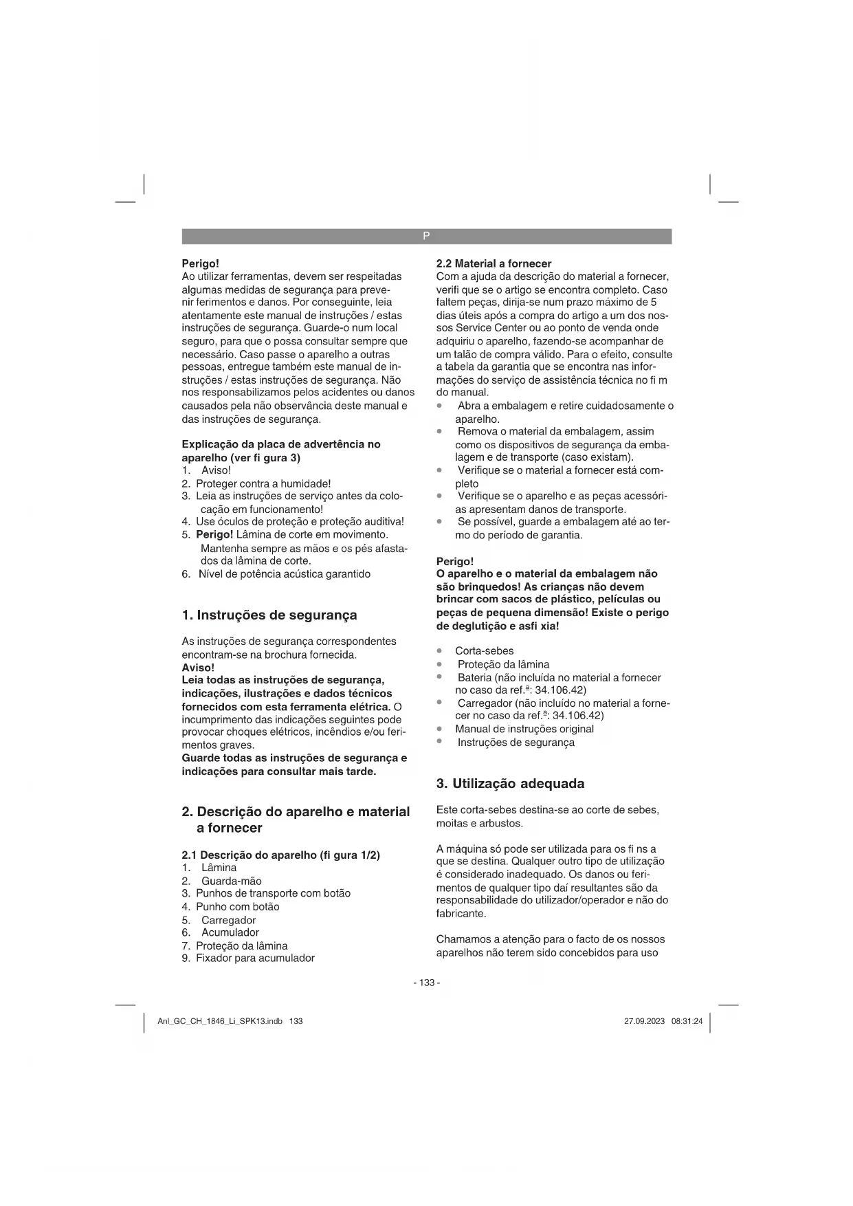 Este corta-sebes destina-se ao corte de sebes, moitas e arbustos. A máquina só pode ser utilizada para os fi ns a que se destina. Qualquer outro tipo de utilização é considerado inadequado. Os danos ou feri- mentos de qualquer tipo daí resultantes são da responsabilidade do utilizador/operador e não do fabricante. Chamamos a atenção para o facto de os nossos aparelhos não terem sido concebidos para uso Anl_GC_CH_1846_Li_SPK13.indb 133Anl_GC_CH_1846_Li_SPK13.indb 133 27.09.2023 08:31:2427.09.2023 08:31:24P