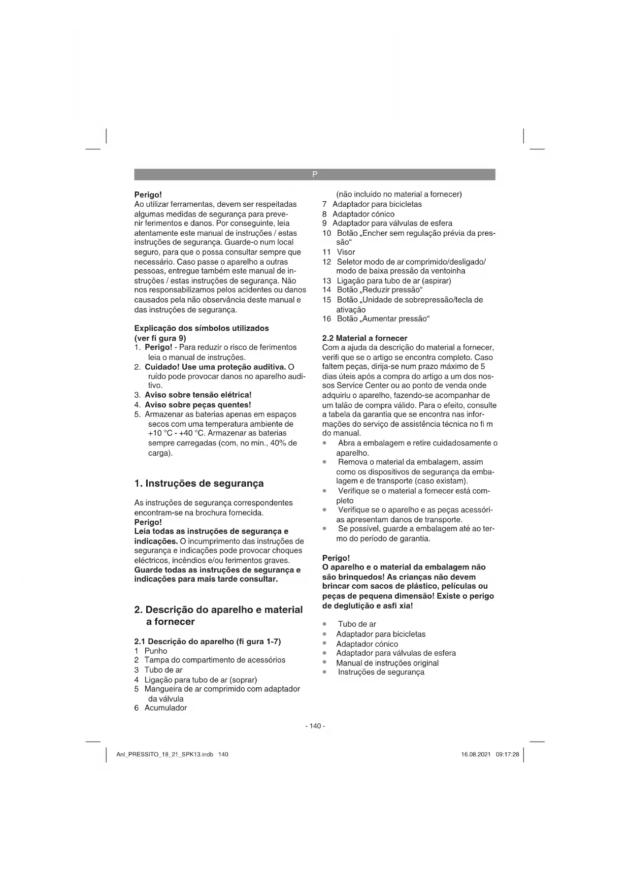 Ao utilizej ferramentas, devem ser respeitas dasomalmas medidas de seguranca para prevenir ferimentos e danos. Por consequence, leia atentamente este manual de instruções / estas instruções de segurança. Guarde-o num local seguro, para que o possa consulir sempre que necessario. Caso passe o aparelho a outras pessoas, entrega quelememual de instruções/estas instruções de segurança. Nao nos responsabilizamos pelos acidentes ou danos causados pela nao observancia destemanual e das instruções de segurança.