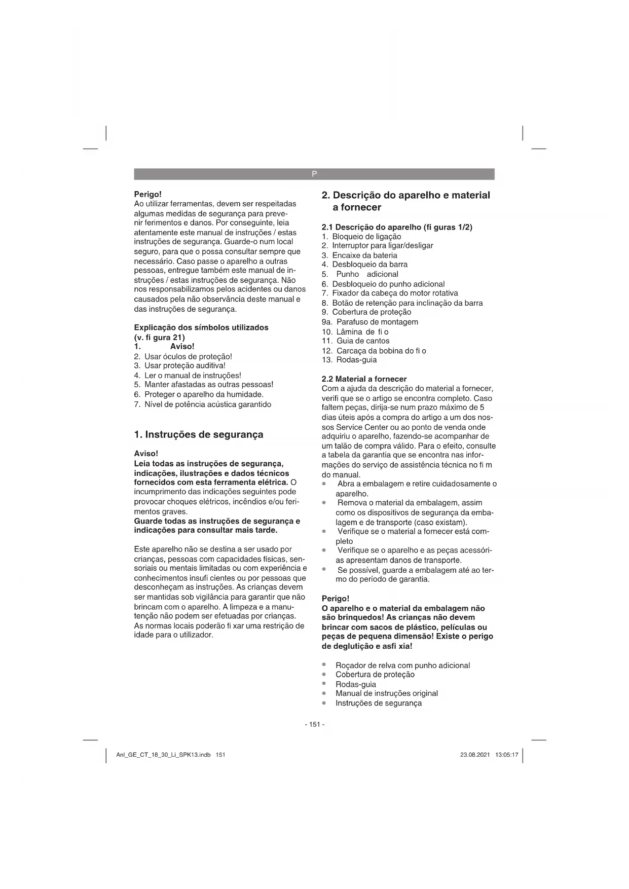 e o pack de baterias para o nosso serviço de assistência técnica. Para o envio correto, contacte o nosso ser- viço de assistência técnica ou o ponto de venda onde adquiriu o aparelho. Ao enviar ou eliminar baterias ou o aparelho sem fi o, certifi que-se de que estes são emba- lados individualmente em sacos de plástico para evitar curto-circuitos e incêndios! Anl_GE_CT_18_30_Li_SPK13.indb 153Anl_GE_CT_18_30_Li_SPK13.indb 153 23.08.2021 13:05:1723.08.2021 13:05:17P