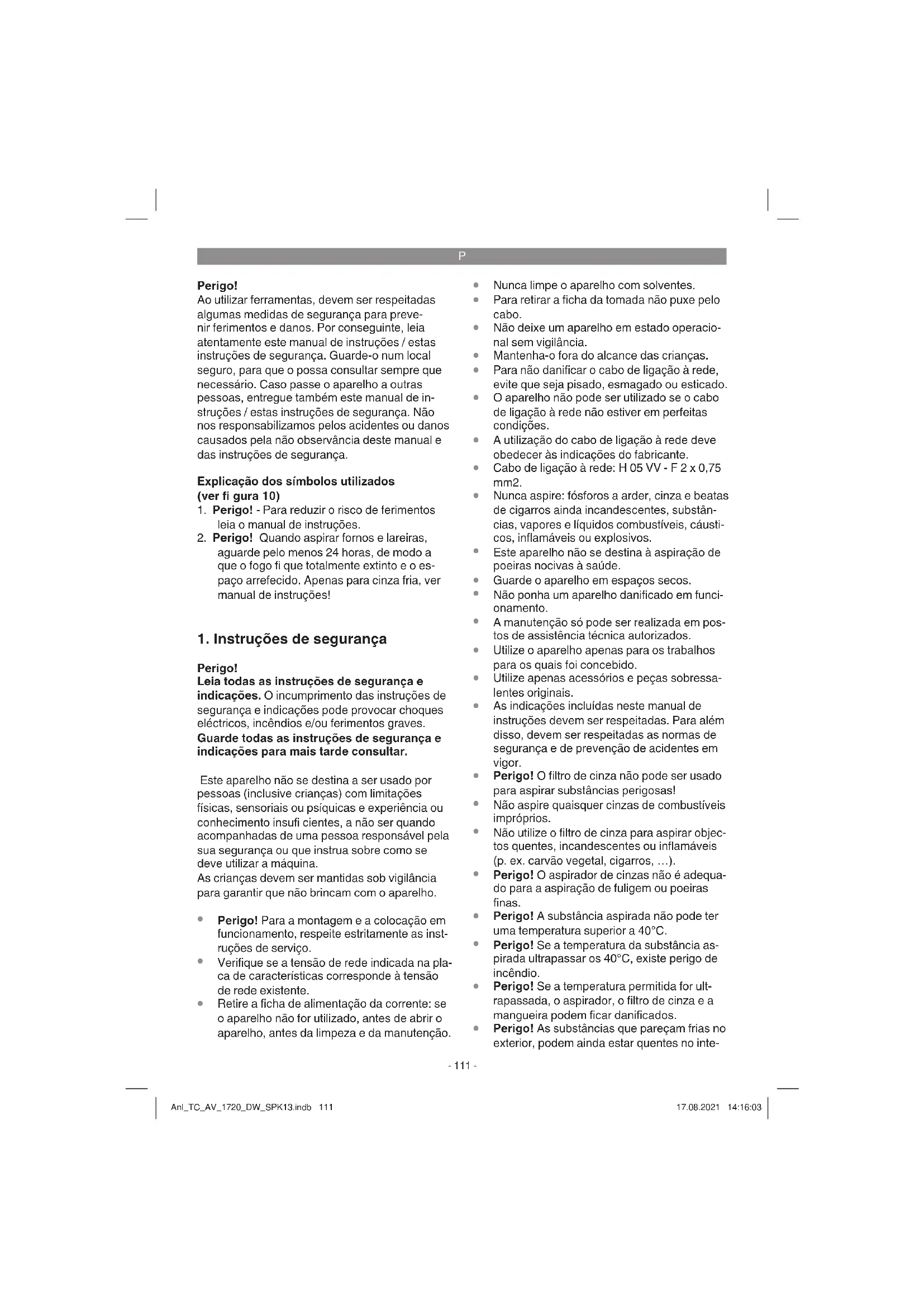 O aspirador de cinzas é adequado para a aspi- ração de cinza fria ou substâncias aspiradas frias em salamandras, fornos a lenha ou a carvão, cinzeiros ou grelhadores. A máquina só pode ser utilizada para os fi ns a que se destina. Qualquer outro tipo de utilização é considerado inadequado. Os danos ou feri- mentos de qualquer tipo daí resultantes são da responsabilidade do utilizador/operador e não do fabricante. Anl_TC_AV_1720_DW_SPK13.indb 112Anl_TC_AV_1720_DW_SPK13.indb 112 17.08.2021 14:16:0317.08.2021 14:16:03P