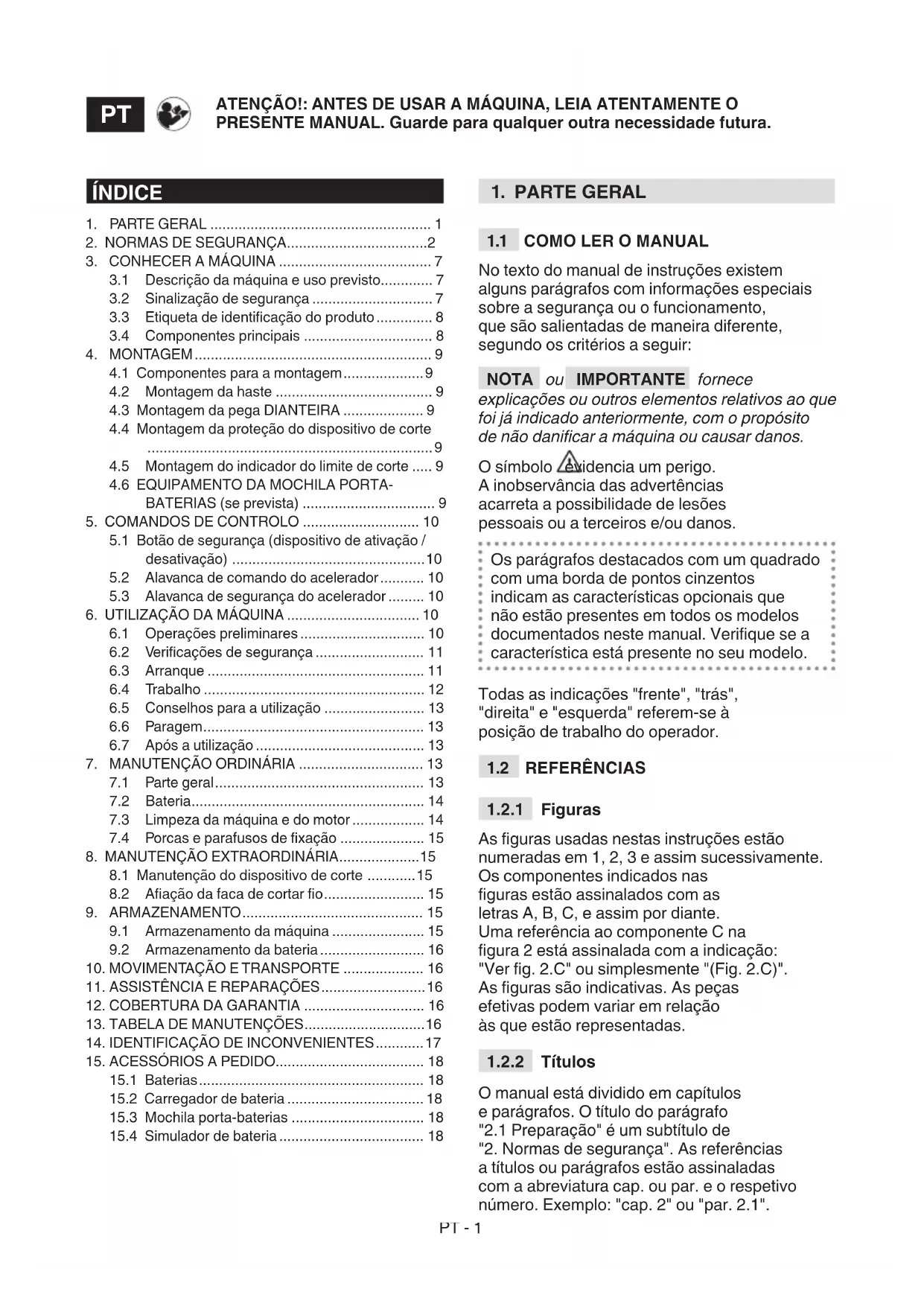 O manual está dividido em capítulos e parágrafos. O título do parágrafo "2.1 Preparação" é um subtítulo de "2. Normas de segurança". As referências a títulos ou parágrafos estão assinaladas com a abreviatura cap. ou par. e o respetivo número. Exemplo: "cap. 2" ou "par. 2.1". ÍNDICE
