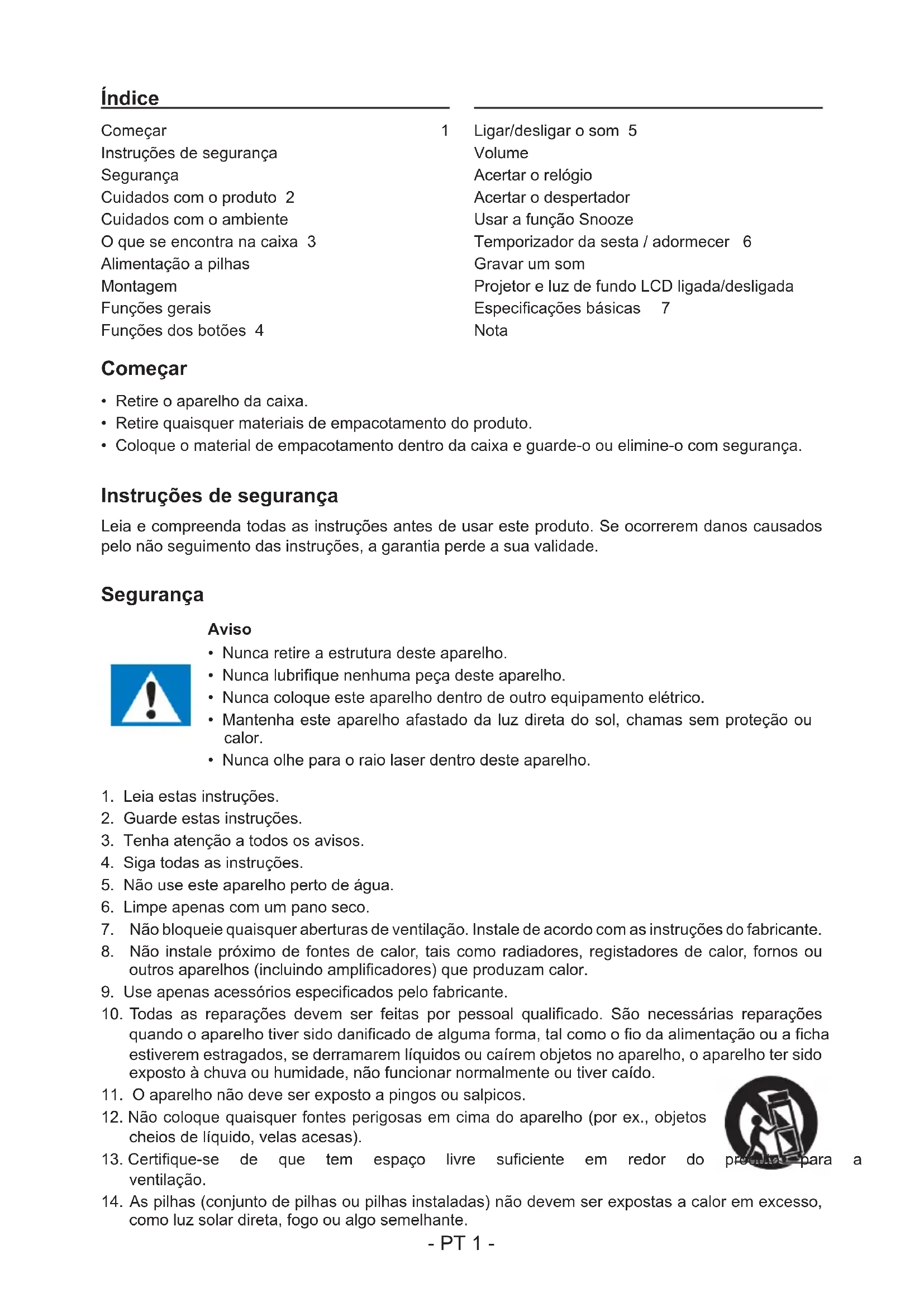 LEIA TODO O MANUAL DE UTILIZADOR ANTES DE TRABALHARCOMESTAUNIDADEEGUARDEOFOLHETO PARA REFERÊNCIA FUTURA. PT- PT 1 - Índice Começar 1 Instruções de segurança Segurança Cuidados com o produto 2 Cuidados com o ambiente O que se encontra na caixa 3 Alimentação a pilhas Montagem Funções gerais Funções dos botões 4 Ligar/desligar o som 5 Volume Acertar o relógio Acertar o despertador Usar a função Snooze Temporizador da sesta / adormecer 6 Gravarumsom Projetor e luz de fundo LCD ligada/desligada Especicaçõesbásicas 7 Nota Começar