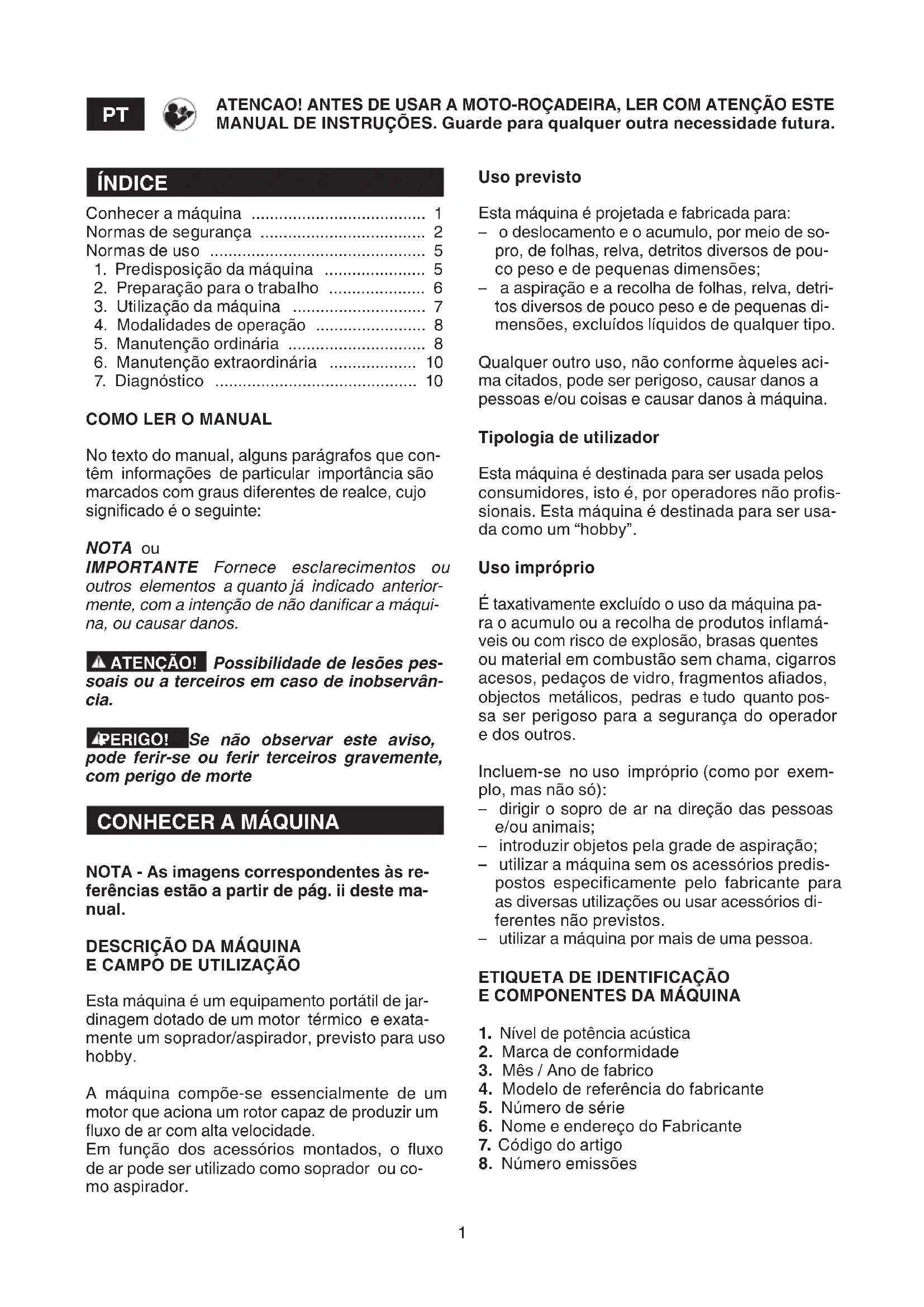 ATENCAO! Antes de usar a moto-roçadeira, ler com atenção este manual de instruções.