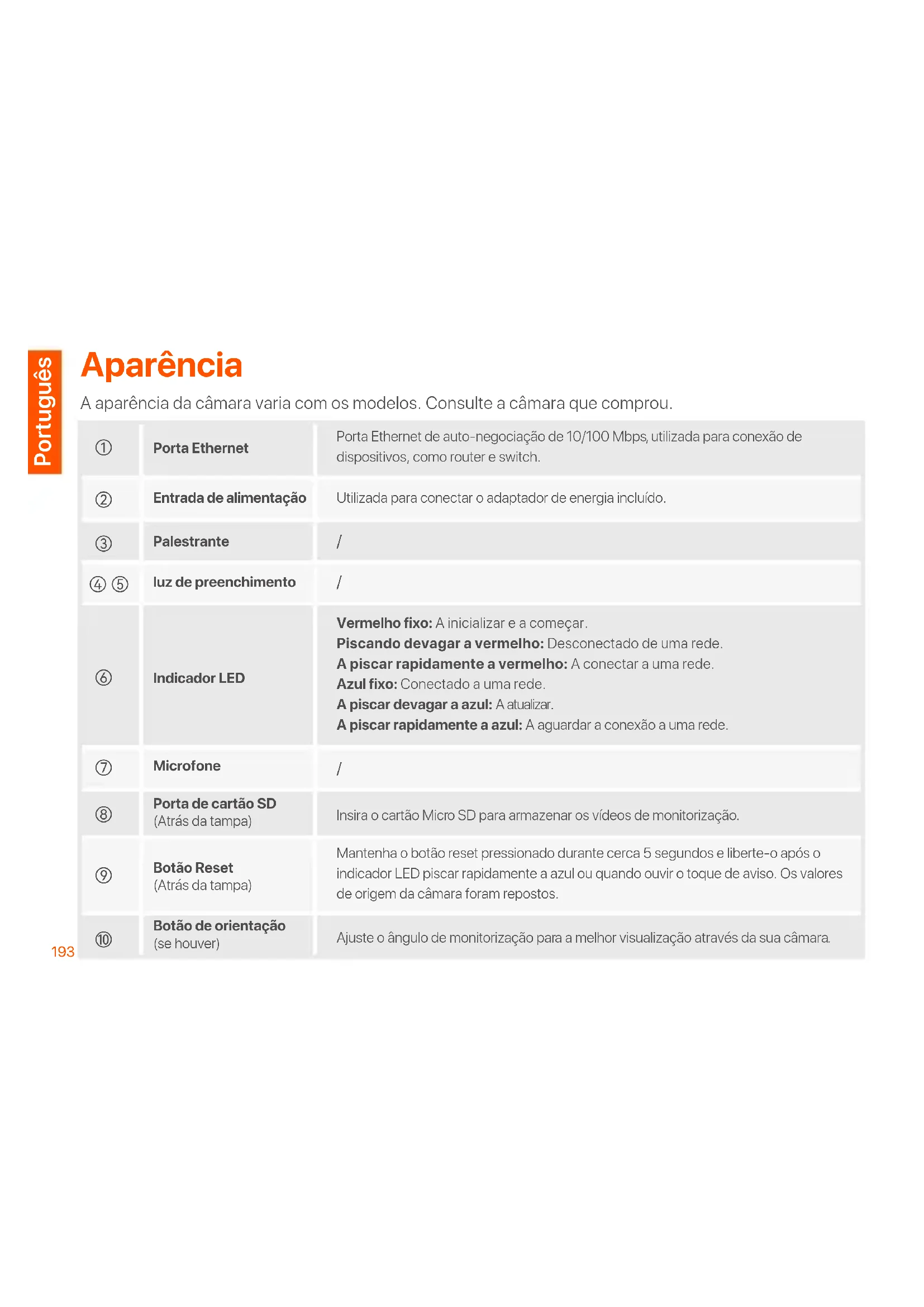 Utilizada para conectar o adaptador de energia incluído. Porta Ethernet de auto-negociação de 10/100 Mbps, utilizada para conexão de dispositivos, como router e switch. Vermelho fixo: A inicializar e a começar. Piscando devagar a vermelho: Desconectado de uma rede. A piscar rapidamente a vermelho: A conectar a uma rede. Azul fixo: Conectado a uma rede. A piscar devagar a azul: A atualizar. A piscar rapidamente a azul: A aguardar a conexão a uma rede. Insira o cartão Micro SD para armazenar os vídeos de monitorização. Mantenha o botão reset pressionado durante cerca 5 segundos e liberte-o após o indicador LED piscar rapidamente a azul ou quando ouvir o toque de aviso. Os valores de origem da câmara foram repostos. Ajuste o ângulo de monitorização para a melhor visualização através da sua câmara. luz de preenchimento Indicador LED Microfone Palestrante