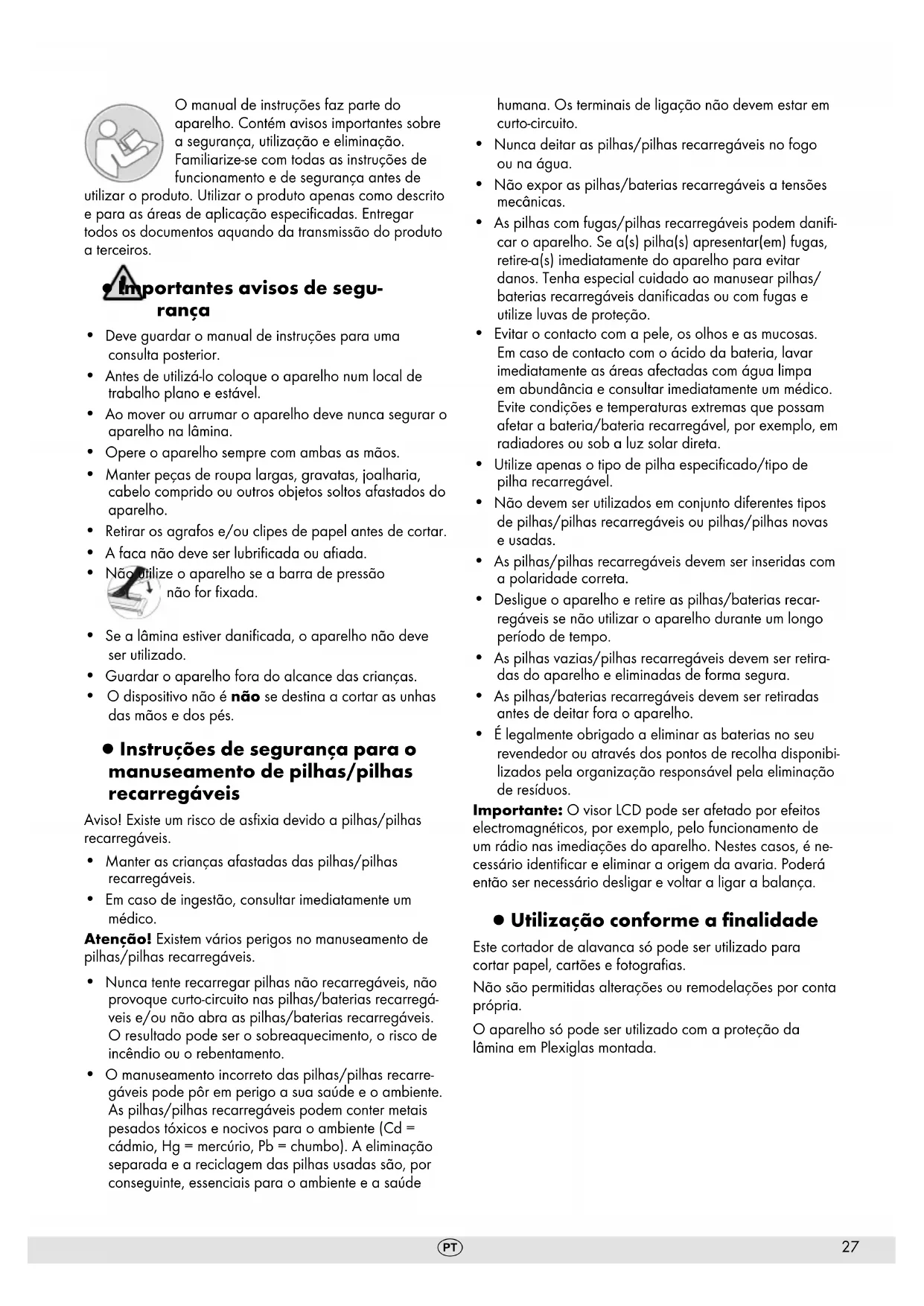 - É legalmente obrigado a eliminar as baterias no seu revendedor ou através dos pontos de recolha disponibi- lizados pela organização responsável pela eliminação de resíduos. Importante: O visor LCD pode ser afetado por efeitos electromagnéticos, por exemplo, pelo funcionamento de um rádio nas imediações do aparelho. Nestes casos, é ne- cessário identicar e eliminar a origem da avaria. Poderá então ser necessário desligar e voltar a ligar a balança. ▯ Utilização conforme a nalidade Este cortador de alavanca só pode ser utilizado para cortar papel, cartões e fotograas. Não são permitidas alterações ou remodelações por conta própria. O aparelho só pode ser utilizado com a proteção da lâmina em Plexiglas montada.28