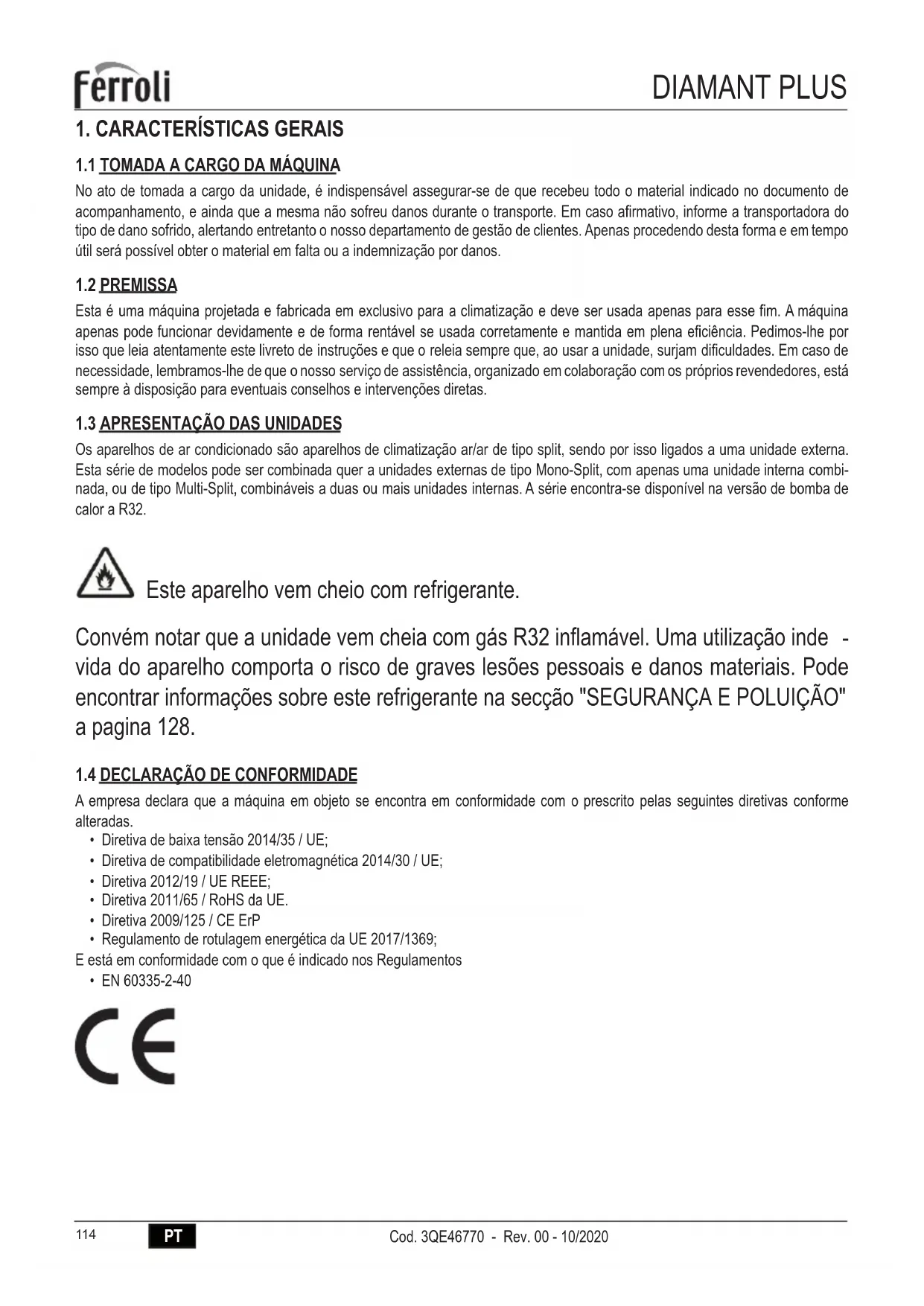 A Ferroli garante os equipamentos que fornece de acordo com a legislação portuguesa D.L. 67/2003 de 8 de Abril, alterado pelo D.L. 84/2008, de 21 de Maio, a chamada Lei das Garantias na venda de Bens de Consumo. O equipamento objeto deste documento e garantia contém um refrigerante fluorado; portanto, o proprietário desse equipamento deve contratar a execução de atividades como instalação, manipulação ou desmontagem a empresas autorizadas de acordo com o Reg. UE 517/2014, com pessoal certificado, conforme apropriado. A FERROLI garante ao primeiro comprador do equipamento de ar condicionado da marca FERROLI, cujo modelo consta na fatura emitida pela FERROLI, que o equipamento fornecido está isento de defeitos de fabricação e que os seus desempenhos são os indi- cados nos manuais e na documentação técnica emitida pelo fabricante. A FERROLI será responsável pelo reparação ou substituição de todos os componentes dos dispositivos com defeitos de fabricação e nas condições de garantia especificadas. Esta garantia é válida, única e exclusivamente, para os aparelhos vendidos e instalados em Portugal.