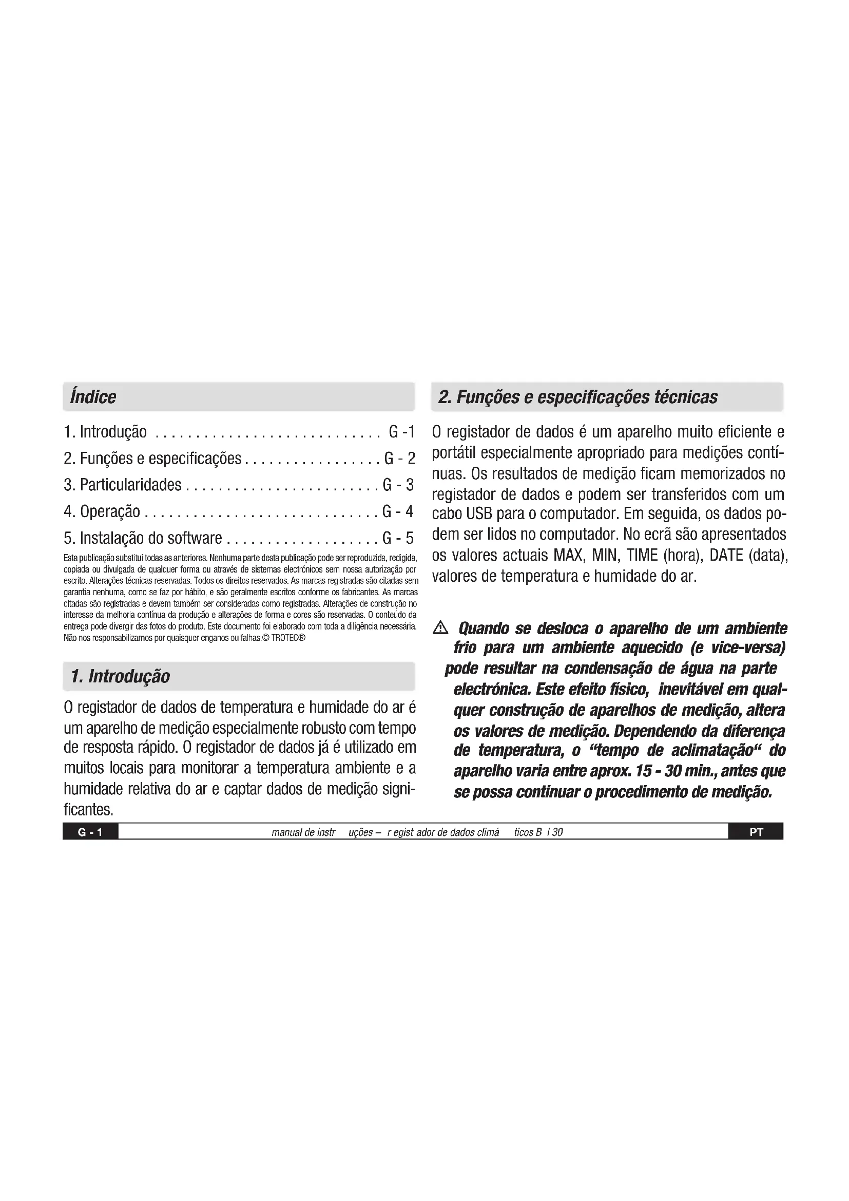 O registador de dados é um aparelho muito eficiente e portátil especialmente apropriado para medições contí- nuas. Os resultados de medição ficam memorizados no registador de dados e podem ser transferidos com um cabo USB para o computador. Em seguida, os dados po- dem ser lidos no computador. No ecrã são apresentados os valores actuais MAX, MIN, TIME (hora), DATE (data), valores de temperatura e humidade do ar. m Quando se desloca o aparelho de um ambiente frio para um ambiente aquecido (e vice-versa) pode resultar na condensação de água na parte electrónica. Este efeito físico, inevitável em qual- quer construção de aparelhos de medição, altera os valores de medição. Dependendo da diferença de temperatura, o “tempo de aclimatação“ do aparelho varia entre aprox. 15 - 30 min., antes que se possa continuar o procedimento de medição. TRO-TR-BA-BL30-HS-002-INT - Kopie.indd 1 08.09.2014 10:19:38PT manual de instr uções – r egist ador de dados climá ticos B l 30 G - 2 m Verifique que o registador de dados permaneça sempre em posição vertical durante o uso/arma- zenamento. Isto deve também ser respeitado após medições realizadas em temperaturas baixas ou em ambientes com alta humidade do ar. Assim deve ser impedido que água condensada possi velmente produzida não se acumule no aparelho e venha a escorrer para a parte inferior do aparel ho. Aguarde até que qualquer humidade, que pos- sa formar-se no interior do aparelho devido a um processo físico, evapore completamente antes de ler e processar os dados captados. Para economi- zar as baterias, o registador de dados pode tam- bém ser directamente ligado ao computador atra- vés do cabo USB. O aparelho conectado ao com putador é alimentado pelo PC.