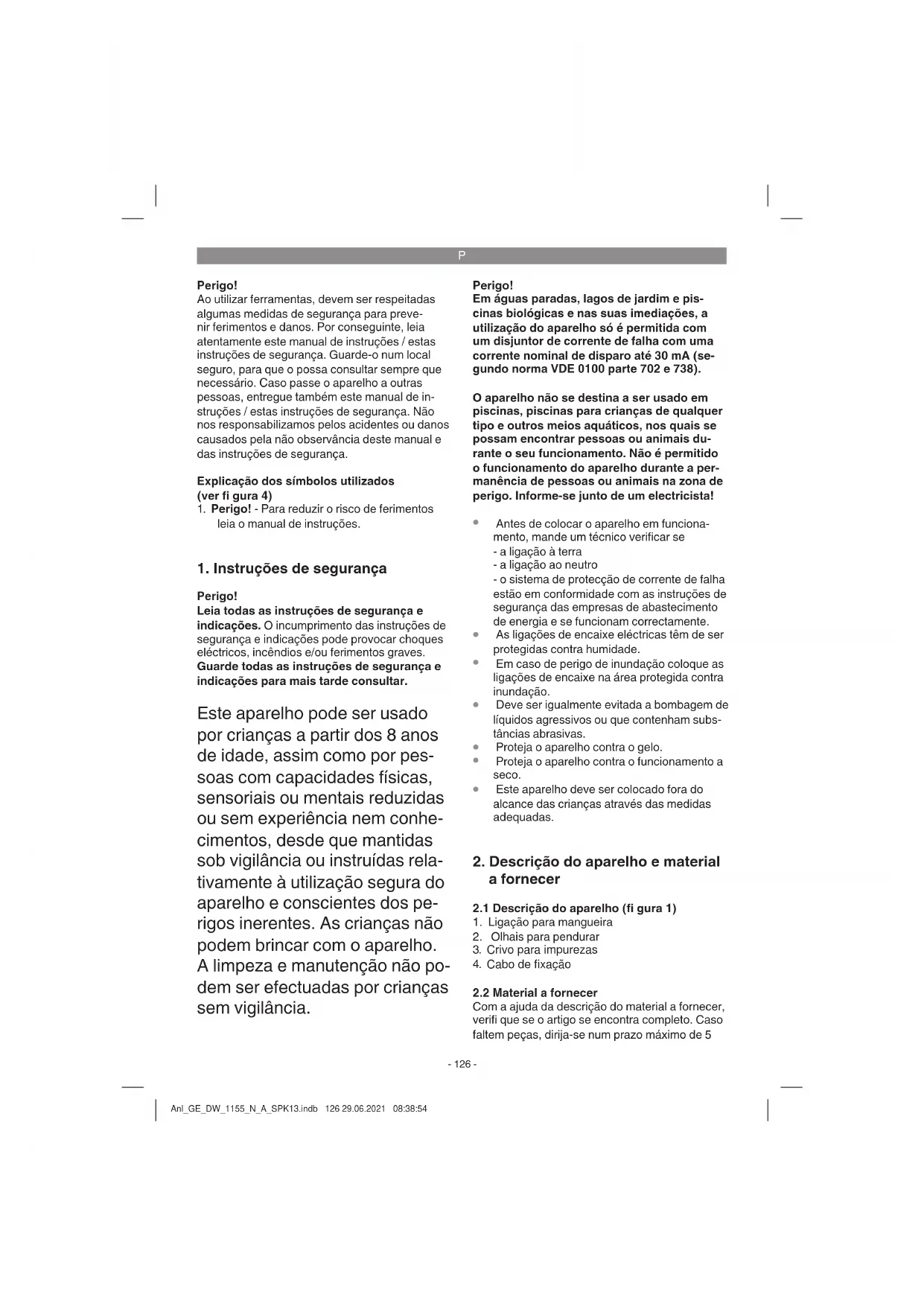 Perigo! Leia todas as instruções de segurança e indicações. O incumprimento das instruções de segurança e indicações pode provocar choques eléctricos, incêndios e/ou ferimentos graves. Guarde todas as instruções de segurança e indicações para mais tarde consultar. Este aparelho pode ser usado por crianças a partir dos 8 anos de idade, assim como por pes- soas com capacidades físicas, sensoriais ou mentais reduzidas ou sem experiência nem conhe- cimentos, desde que mantidas sob vigilância ou instruídas rela- tivamente à utilização segura do aparelho e conscientes dos pe- rigos inerentes. As crianças não podem brincar com o aparelho. A limpeza e manutenção não po- dem ser efectuadas por crianças sem vigilância. Perigo! Em águas paradas, lagos de jardim e pis- cinas biológicas e nas suas imediações, a utilização do aparelho só é permitida com um disjuntor de corrente de falha com uma corrente nominal de disparo até 30 mA (se- gundo norma VDE 0100 parte 702 e 738). O aparelho não se destina a ser usado em piscinas, piscinas para crianças de qualquer tipo e outros meios aquáticos, nos quais se possam encontrar pessoas ou animais du- rante o seu funcionamento. Não é permitido o funcionamento do aparelho durante a per- manência de pessoas ou animais na zona de perigo. Informe-se junto de um electricista!