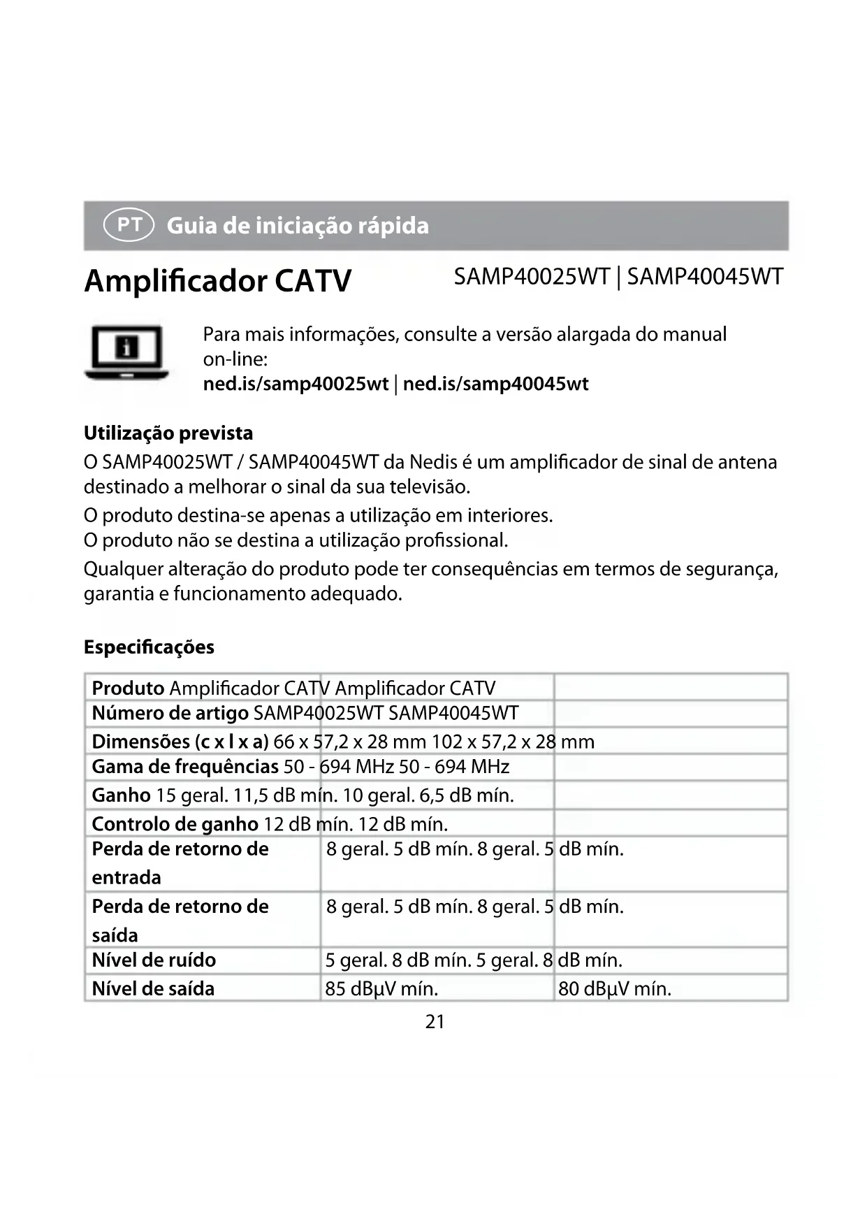 Para mais informações, consulte a versão alargada do manual on-line: ned.is/samp40025wt | ned.is/samp40045wt Utilização prevista O SAMP40025WT / SAMP40045WT da Nedis é um amplicador de sinal de antena destinado a melhorar o sinal da sua televisão. O produto destina-se apenas a utilização em interiores. O produto não se destina a utilização prossional. Qualquer alteração do produto pode ter consequências em termos de segurança, garantia e funcionamento adequado. Especicações Produto Amplicador CATV Amplicador CATV Número de artigo SAMP40025WT SAMP40045WT Dimensões (c x l x a) 66 x 57,2 x 28 mm 102 x 57,2 x 28 mm Gama de frequências 50 - 694 MHz 50 - 694 MHz Ganho 15 geral. 11,5 dB mín. 10 geral. 6,5 dB mín. Controlo de ganho 12 dB mín. 12 dB mín. Perda de retorno de entrada 8 geral. 5 dB mín. 8 geral. 5 dB mín. Perda de retorno de saída 8 geral. 5 dB mín. 8 geral. 5 dB mín. Nível de ruído 5 geral. 8 dB mín. 5 geral. 8 dB mín. Nível de saída 85 dBµV mín. 80 dBµV mín.22 Impedância 75 Ω 75 Ω Conetor de entrada IEC fêmea x1 IEC fêmea x1 Conetor de saída IEC macho x2 IEC macho x4 Entrada do adaptador de alimentação