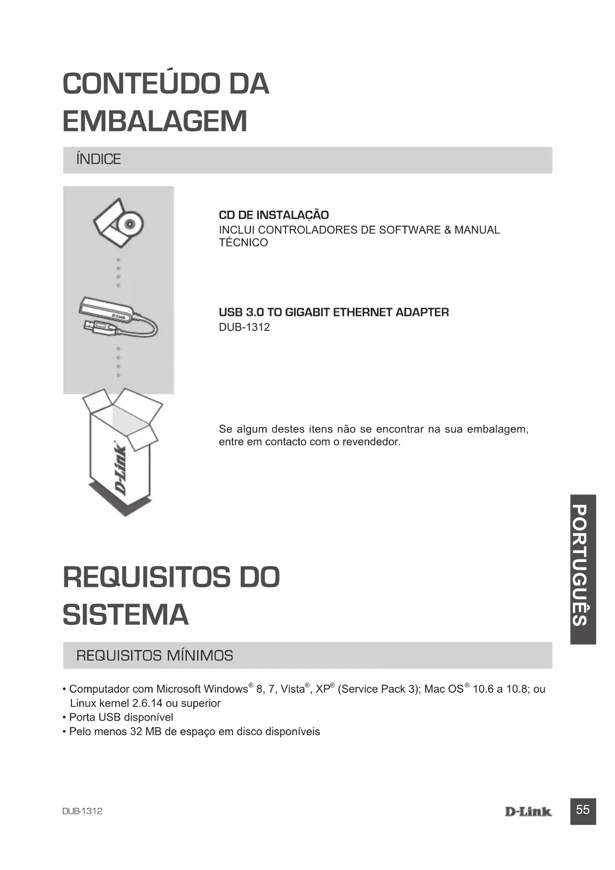 TÉCNICO USB 3.0 TO GIGABIT EThErNET ADAPTEr DUB-1312 ÍNDICE Se algum destes itens não se encontrar na sua embalagem, entre em contacto com o revendedor.