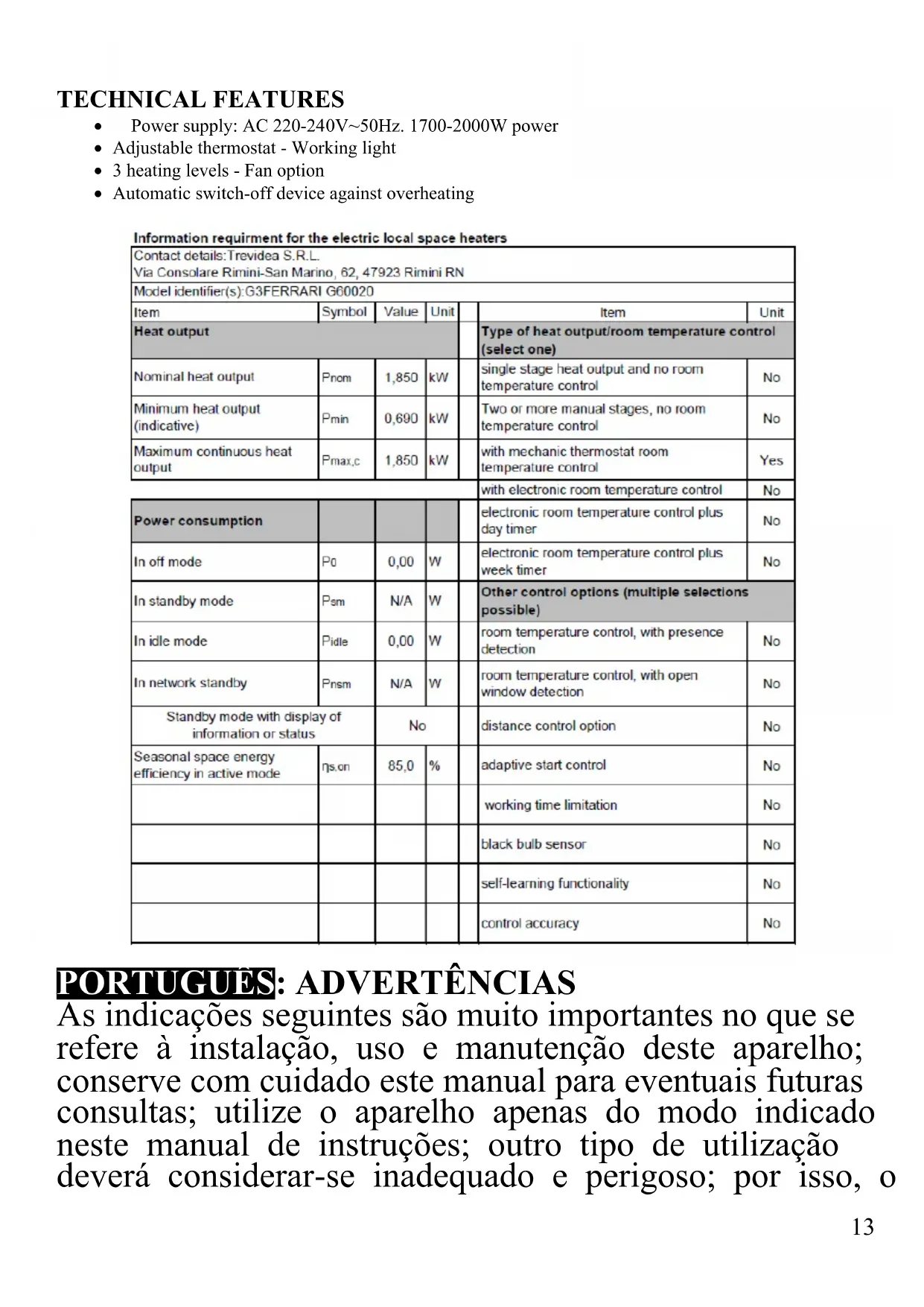 Tepor G60020 - Aquecimento G3 Ferrari - Manual de utilização gratuito