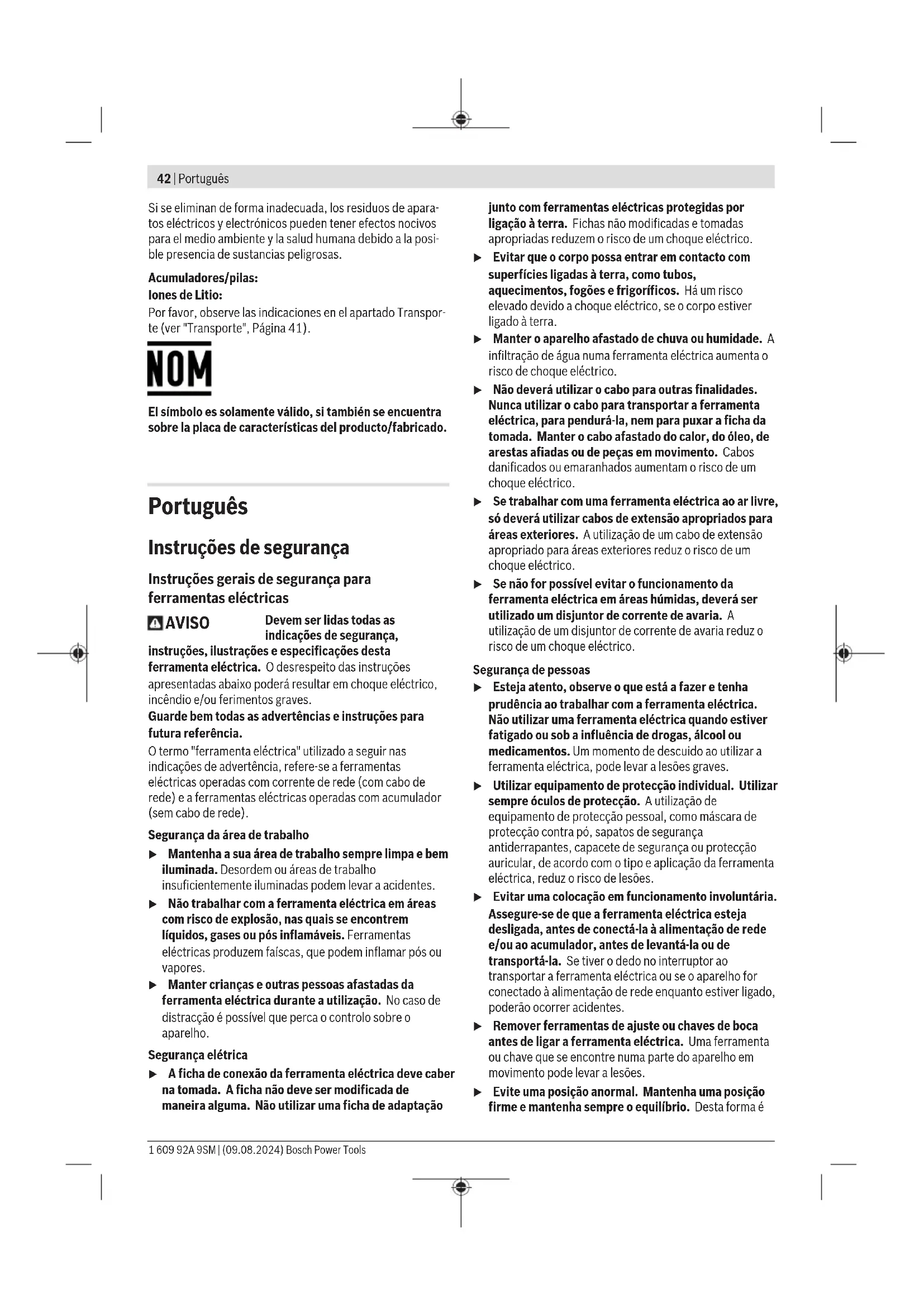 O nível de vibrações indicado nestas instruções e o valor de emissões sonoras foram medidos de acordo com um processo de medição normalizado e podem ser utilizados para a comparação de ferramentas elétricas. Também são adequados para uma avaliação provisória das emissões sonoras e de vibrações. O nível de vibrações indicado e o valor de emissões sonoras representam as aplicações principais da ferramenta elétrica. Se a ferramenta elétrica for utilizada para outras aplicações, com outras ferramentas de trabalho ou com manutenção insuficiente, é possível que o nível de vibrações e de emissões sonoras seja diferente. Isto pode aumentar 1 609 92A 9SM | (09.08.2024) Bosch Power ToolsPortuguês | 47 sensivelmente a emissão sonora e de vibrações para o período completo de trabalho. Para uma estimação exata da emissão sonora e de vibrações, também deveriam ser considerados os períodos nos quais o aparelho está desligado ou funciona, mas não está sendo utilizado. Isto pode reduzir a emissão sonora e de vibrações durante o completo período de trabalho. Além disso também deverão ser estipuladas medidas de segurança para proteger o operador contra o efeito de vibrações, como por exemplo: manutenção de ferramentas elétricas e acessórios, manter as mãos quentes e organização dos processos de trabalho. Indicações acerca da precisão A redução do número de rotações (especialmente abaixo de 50%) pode ter como consequência um redução do binário máximo. O número de rotações aumentado no Power Boost pode ter influência sobre a precisão do comportamento de desligamento. A embraiagem pode travar demais. Normalmente os estudos de capacidade da máquina são feitos a 600r.p.m. segundo VDI2647. Alterações do número de rotações e/ou do binário podem influenciar a precisão. A capacidade da máquina tem de ser testada com o respetivo ajuste. Bateria Bosch vende ferramentas elétricas sem fio também sem bateria. Pode consultar na embalagem se está incluída uma bateria no volume de fornecimento da sua ferramenta elétrica. Carregar a bateria u Utilize apenas os carregadores listados nos dados técnicos. Só estes carregadores são apropriados para os baterias de lítio utilizadas para a sua ferramenta elétrica. Nota: devido a normas de transporte internacionais, as baterias de lítio são fornecidas parcialmente carregadas. Para assegurar a completa potência da bateria, a bateria deverá ser carregada completamente antes da primeira utilização. Colocar a bateria Insira a bateria carregada no respetivo encaixe, até que esta esteja engatada. Retirar a bateria Para retirar a bateria, pressione as respetivas teclas de desbloqueio e puxe a bateria para fora. Não empregue força. Indicador do nível de carga da bateria (LED amarelo) Indicador do nível de carga da bateria Significado Luz intermitente + sinal acústico Carregar a bateria: Já só são possíveis 6–8 aparafusamentos. Luz permanente + sinal acústico A capacidade já não é suficiente para um novo aparafusamento ou a ferramenta elétrica foi sobrecarregada: Não é possível voltar a ligar a ferramenta elétrica. – Retire a bateria e coloque uma bateria totalmente carregada. Luz intermitente A ferramenta elétrica sobreaqueceu e está fora de funcionamento: – Aguarde até que a luz intermitente se apague automaticamente após breves instantes, antes de voltar a colocar a ferramenta elétrica em funcionamento. Ao colocar a bateria(7) e premir o interruptor de ligar/ desligar(8) o indicador do nível de carga da bateria indica o nível de carga da bateria durante 5segundos. Indicador do nível de carga da bateria Capacidade Verde 60–100% Amarelo 30–60% Vermelho 0–30% Indicações sobre o manuseio ideal da bateria Proteger a bateria contra humidade e água. Armazene a bateria apenas na faixa de temperatura de −20°C a 50°C. Por exemplo, não deixe a bateria dentro do automóvel no verão. Um tempo de funcionamento reduzido após o carregamento indica que a bateria está gasta e que deve ser substituída. Observe as indicações sobre a eliminação de forma ecológica. Montagem u Antes de qualquer trabalho na ferramenta elétrica (p. ex. manutenção, troca de ferramenta, etc.) retire a bateria da mesma. Há perigo de ferimentos se o interruptor de ligar/desligar for acionado involuntariamente. Área de funcionamento e de armazenamento A ferramenta elétrica é exclusivamente adequada para o funcionamento em locais de utilização fechados. Bosch Power Tools 1 609 92A 9SM | (09.08.2024)48 | Português Para um funcionamento em perfeitas condições, a temperatura ambiente admissível deve situar-se entre 0 °C e +45 °C, com uma humidade relativa do ar admissível entre 20 e 95% sem condensação. Dispositivo de suporte (verfiguraA) Com o aro de suspensão(12) é possível fixar a ferramenta elétrica a um dispositivo de suporte. – Coloque o aro de suspensão da ferramenta(12) na ferramenta elétrica e deixe-o engatar os furos(13). u Controle regularmente o estado do aro de suspensão da ferramenta e dos ganchos no dispositivo de suporte. Montagem da cabeça angular 180 W (verfiguraB) Nestas aparafusadoras angulares sem fio industriais é necessário montar primeiro um adaptador e um mandril angular adequado (ver "Dados técnicos", Página45). – Coloque a cabeça angular 180 W no adaptador e aperte-a com uma chave de bocas(16) na área da chave da porca de capa(14). No processo, segure a chave de bocas(17) na área da chave do adaptador(15). u A rosca e a rosca de flange têm de estar isentas de gordura e é necessário aplicar o respetivo binário(ver "Dados técnicos", Página45) para que a cabeça angular não se possa soltar. – Rode a contraporca(18), no sentido da seta a (rosca à esquerda) totalmente para trás. – Rode agora o adaptador no sentido da seta a (rosca à esquerda) totalmente para trás. u Nunca fixe a ferramenta elétrica 