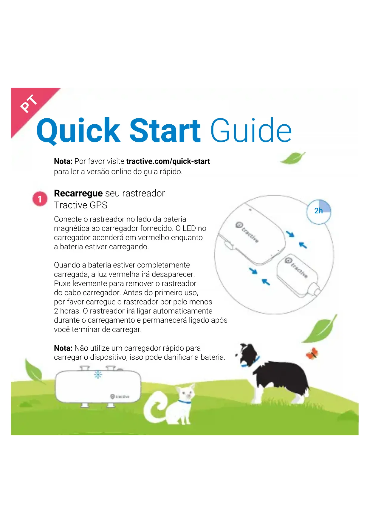 Recarregue seu rastreador Tractive GPS Conecte o rastreador no lado da bateria magnética ao carregador fornecido. O LED no carregador acenderá em vermelho enquanto a bateria estiver carregando. Quando a bateria estiver completamente carregada, a luz vermelha irá desaparecer. Puxe levemente para remover o rastreador do cabo carregador. Antes do primeiro uso, por favor carregue o rastreador por pelo menos 2 horas. O rastreador irá ligar automaticamente durante o carregamento e permanecerá ligado após você terminar de carregar. Nota: Não utilize um carregador rápido para carregar o dispositivo; isso pode danicar a bateria. Nota: Por favor visite tractive.com/quick-start para ler a versão online do guia rápido.2