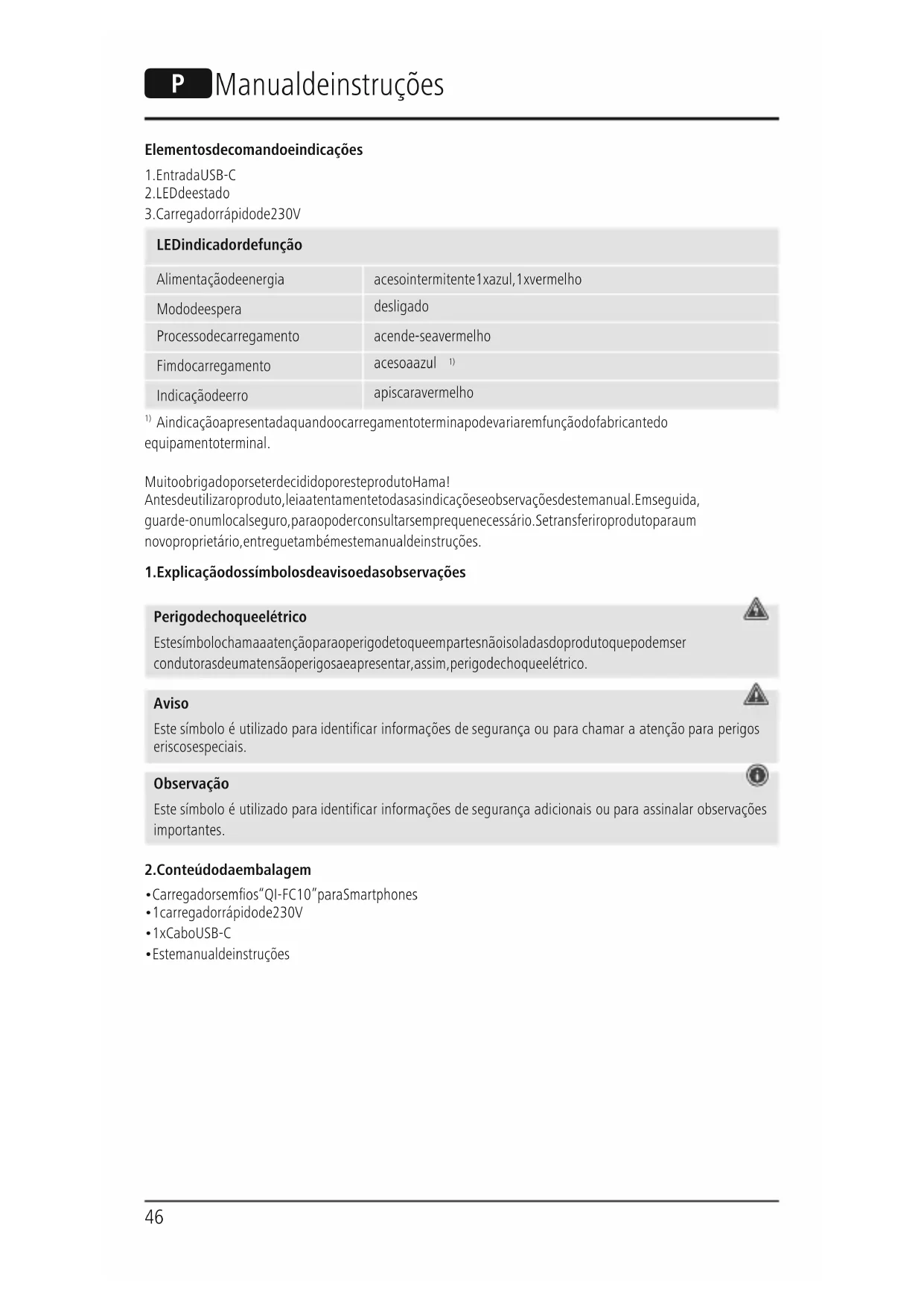 A indicação apresentada quando o carregamento termina pode variar em função do fabricante do equipamento terminal. Muito obrigado por se ter decidido por este produto Hama! Antes de utilizar o produto, leia atentamente todas as indicações e observações deste manual. Em seguida, guarde-o num local seguro, para o poder consultar sempre que necessário. Se transferir o produto para um novo proprietário, entregue também este manual de instruções.