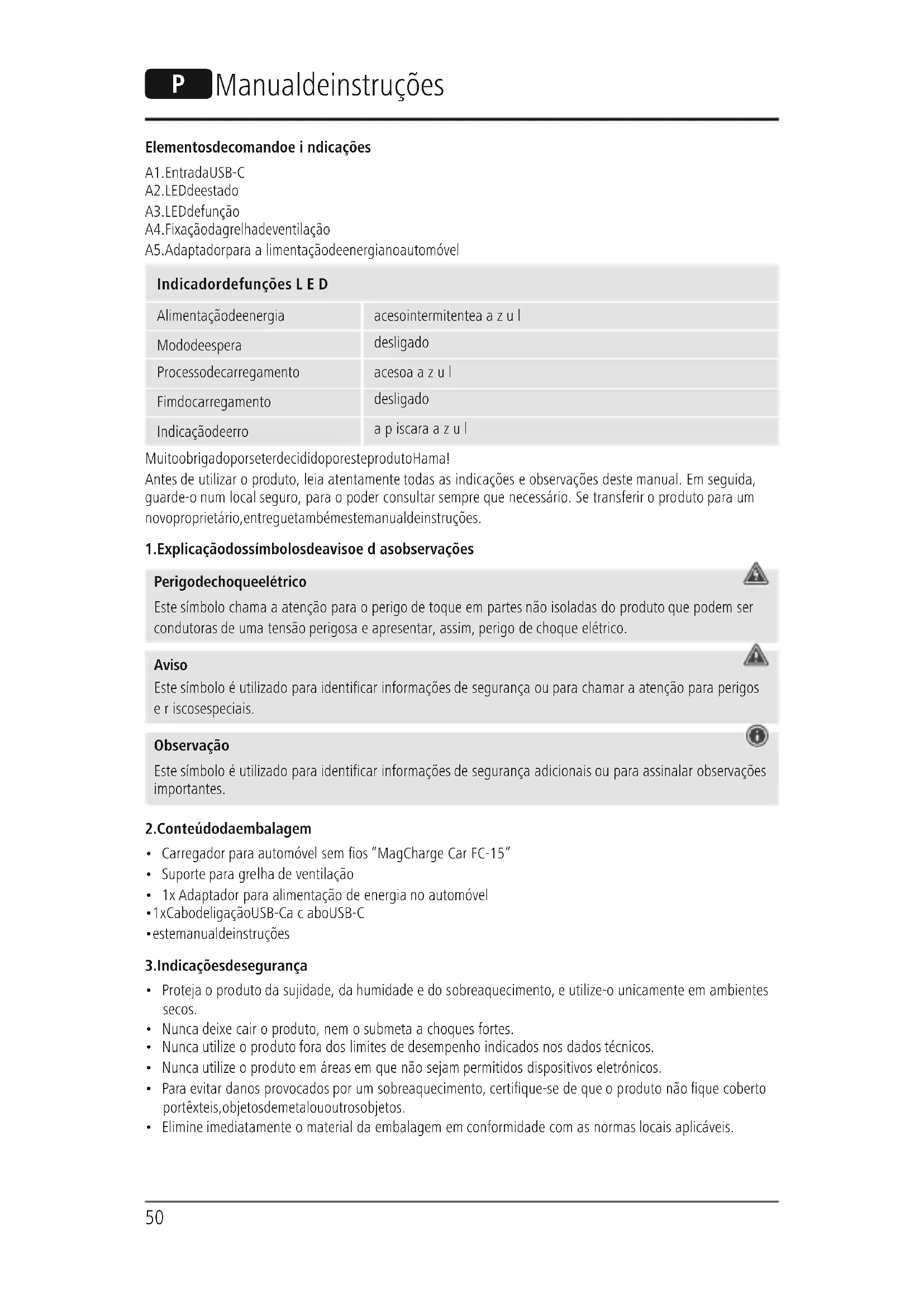 Hama GmbH &CoKG týmto vyhlasuje, že rádiové zariadenie typu [00187268] je vsúlade so smernicou 2014/53/EÚ. Úplné EÚ vyhlásenie ozhode je kdispozícii na tejto internetovej adrese: www.hama.com ->00187268 ->Downloads. Frekvenčné pásmo/frekvenčné pásma 112.600KHz –152.600KHz Vyžarovaný maximálny prenosový výkon -14.69dBµA/m pri 10m50 O Manual de instruções Elementos de comando eindicações A1. Entrada USB-C A2. LED de estado A3. LED de função A4. Fixação da grelha de ventilação A5. Adaptador paraalimentação de energia no automóvel Indicador de funçõesLED Alimentação de energia aceso intermitente aazul Modo de espera desligado Processo de carregamento aceso aazul Fim do carregamento desligado Indicação de erro apiscar aazul Muito obrigado por se ter decidido por este produto Hama! Antes de utilizar oproduto, leia atentamente todas as indicações eobservações deste manual. Em seguida, guarde-o num local seguro, paraopoder consultar sempreque necessário. Se transferir oproduto paraum novo proprietário, entregue também este manual de instruções.