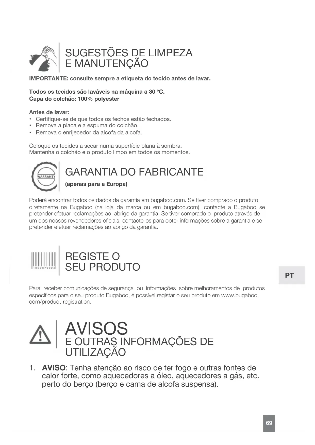 (apenas para a Europa) Poderá encontrar todos os dados da garantia em bugaboo.com. Se tiver comprado o produto diretamente na Bugaboo (na loja da marca ou em bugaboo.com), contacte a Bugaboo se pretender efetuar reclamações ao abrigo da garantia. Se tiver comprado o produto através de um dos nossos revendedores ociais, contacte-os para obter informações sobre a garantia e se pretender efetuar reclamações ao abrigo da garantia. REGISTE O SEU PRODUTO Para receber comunicações de segurança ou informações sobre melhoramentos de produtos especícos para o seu produto Bugaboo, é possível registar o seu produto em www.bugaboo. com/product-registration. AVISOS