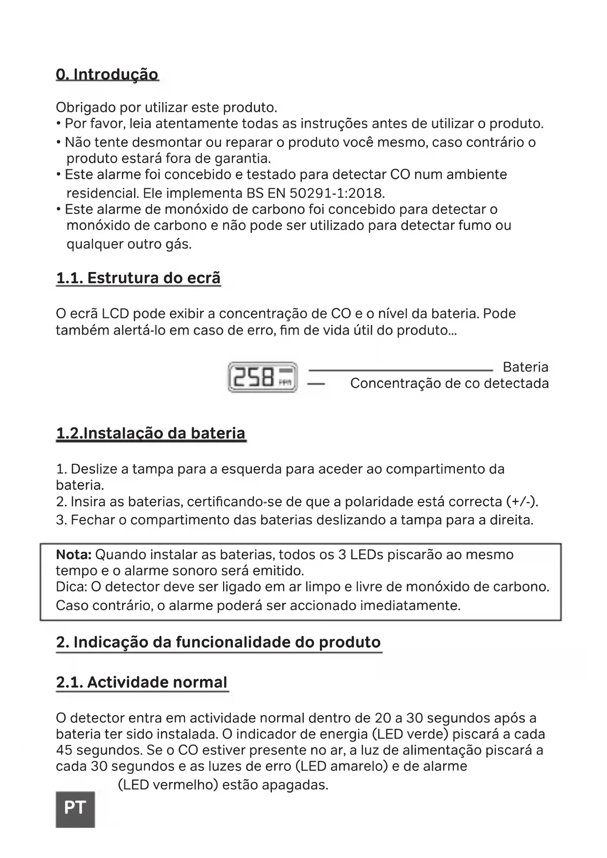 2.1. Actividade normal O detector entra em actividade normal dentro de 20 a 30 segundos após a bateria ter sido instalada. O indicador de energia (LED verde) piscará a cada 45 segundos. Se o CO estiver presente no ar, a luz de alimentação piscará a cada 30 segundos e as luzes de erro (LED amarelo) e de alarme (LED vermelho) estão apagadas. Bateria Concentração de co detectada PTO visor mostrará isto para indicar que a unidade está ligada. 2.2. Alerta de alarma O alarme não irá parar até que a concentração de CO seja inferior a 40 PPM. Coloque o detector em ar fresco para que o alarme possa ser automati- camente parado após 6 minutos, ou pode simplesmente parar o alarme premindo o botão TESTE durante 1 a 3 segundos. Quando a concentração de CO estiver acima de 550 PPM, o visor mostrará isto O LED vermelho piscará 5 vezes com «bipes». O alarme soará 3 vezes a cada 10 segundos. Nota: Quando ouvir bipes sucessivos, isto signica uma alta concentração de CO. Por favor, abandonar imediatamente a sala e pedir ajuda. 2.3. Aviso de baixa concentração de CO Quando a concentração de CO excede 30 PPM durante mais de 60 minutos, ou quando a concentração de CO excede 40 ppm durante mais de 40 minu- tos, é gerado um aviso de baixa concentração de CO. A advertência de baixa concentração de CO difere signicativamente da advertência de alarme: Aviso de baixa emissão de CO Alarme de alarme (detecção de Co elevado) O LED vermelho pisca 4x e emite bipes a baixa velocidade. Repete 1x a cada 3 a 5 segundos. O LED vermelho pisca 5 vezes e emite um sinal sonoro a alta velocidade. O alarme soa 3 vezes a cada 10 segundos.