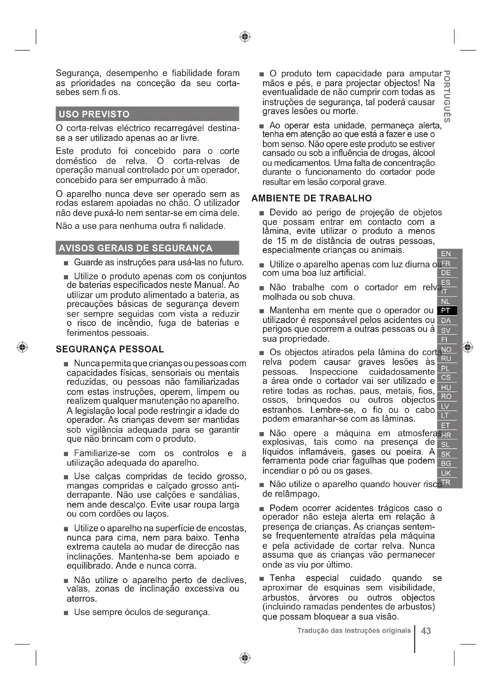 ■ Devido ao perigo de projeção de objetos que possam entrar em contacto com a lâmina, evite utilizar o produto a menos de 15 m de distância de outras pessoas, especialmente crianças ou animais. ■ Utilize o aparelho apenas com luz diurna ou com uma boa luz artificial. ■ Não trabalhe com o cortador em relva molhada ou sob chuva. ■ Mantenha em mente que o operador ou o utilizador é responsável pelos acidentes ou perigos que ocorrem a outras pessoas ou à sua propriedade. ■ Os objectos atirados pela lâmina do corta relva podem causar graves lesões às pessoas. Inspeccione cuidadosamente a área onde o cortador vai ser utilizado e retire todas as rochas, paus, metais, fios, ossos, brinquedos ou outros objectos estranhos. Lembre-se, o fio ou o cabo podem emaranhar-se com as lâminas. ■ Não opere a máquina em atmosferas explosivas, tais como na presença de líquidos inflamáveis, gases ou poeira. A ferramenta pode criar fagulhas que podem incendiar o pó ou os gases. ■ Não utilize o aparelho quando houver risco de relâmpago. ■ Podem ocorrer acidentes trágicos caso o operador não esteja alerta em relação à presença de crianças. As crianças sentem- se frequentemente atraídas pela máquina e pela actividade de cortar relva. Nunca assuma que as crianças vão permanecer onde as viu por último. ■ Tenha especial cuidado quando se aproximar de esquinas sem visibilidade, arbustos, árvores ou outros objectos (incluindo ramadas pendentes de arbustos) que possam bloquear a sua visão.44 Tradução das instruções originais