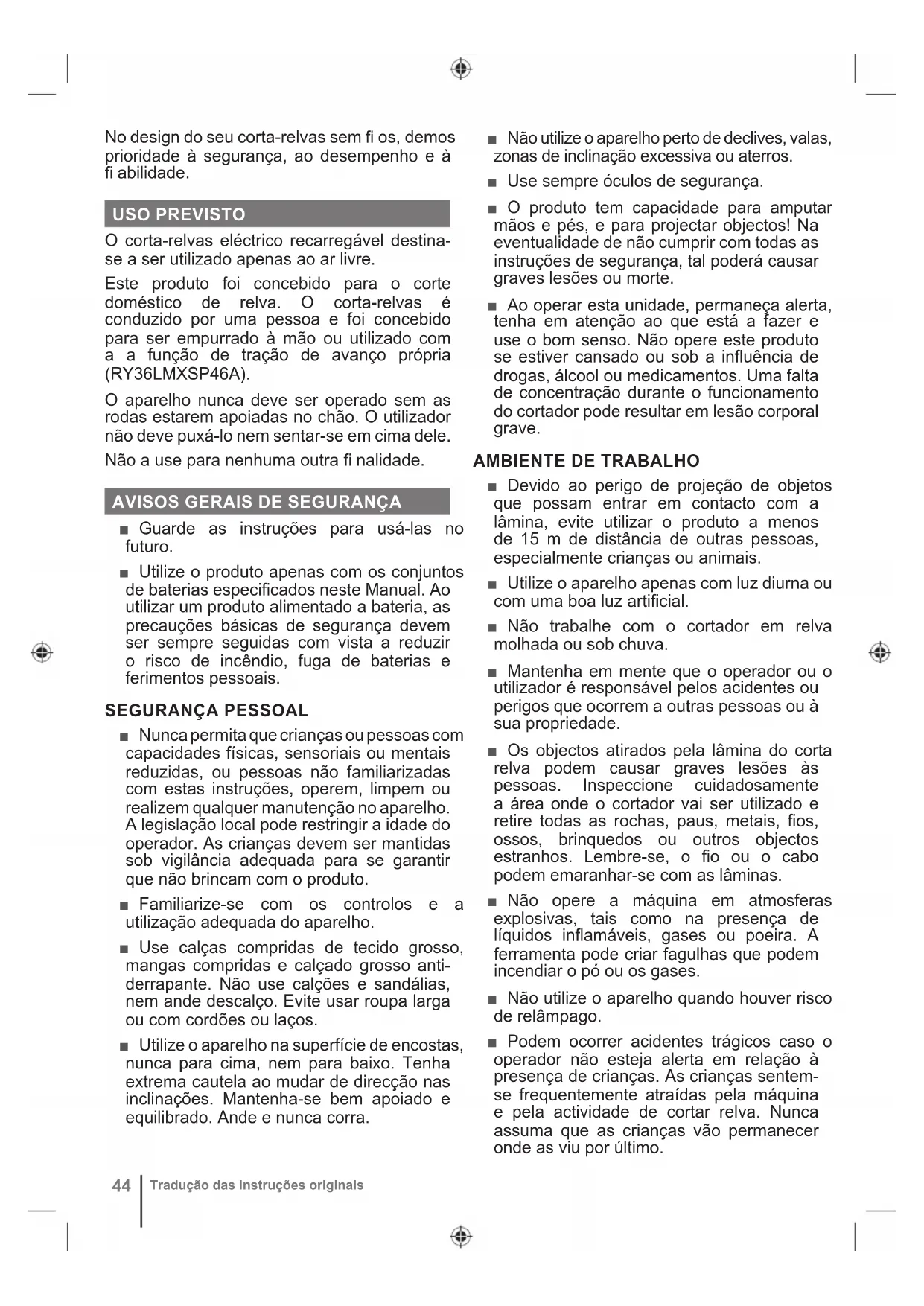 lage snelheid draait voor het snijden van dun gras.44 Tradução das instruções originais No design do seu corta-relvas sem fi os, demos prioridade à segurança, ao desempenho e à fi abilidade. USO PREVISTO O corta-relvas eléctrico recarregável destina- se a ser utilizado apenas ao ar livre. Este produto foi concebido para o corte doméstico de relva. O corta-relvas é conduzido por uma pessoa e foi concebido para ser empurrado à mão ou utilizado com a a função de tração de avanço própria (RY36LMXSP46A). O aparelho nunca deve ser operado sem as rodas estarem apoiadas no chão. O utilizador não deve puxá-lo nem sentar-se em cima dele. Não a use para nenhuma outra fi nalidade.