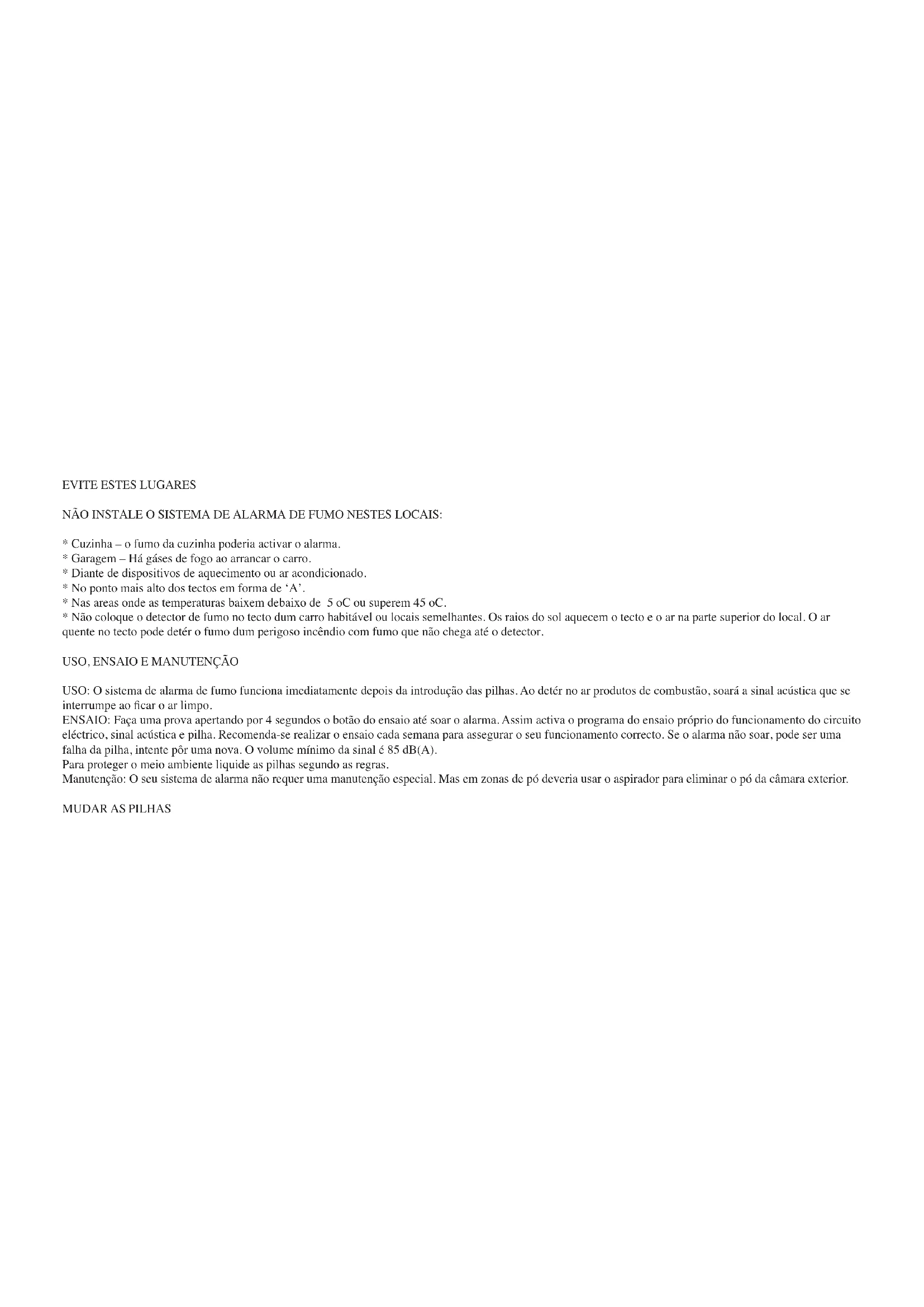 USO: O sistema de alarma de fumo funciona imediatamente depois da introdução das pilhas. Ao detér no ar produtos de combustão, soará a sinal acústica que se interrumpe ao car o ar limpo. ENSAIO: Faça uma prova apertando por 4 segundos o botão do ensaio até soar o alarma. Assim activa o programa do ensaio próprio do funcionamento do circuito eléctrico, sinal acústica e pilha. Recomenda-se realizar o ensaio cada semana para assegurar o seu funcionamento correcto. Se o alarma não soar, pode ser uma falha da pilha, intente pôr uma nova. O volume mínimo da sinal é 85 dB(A). Para proteger o meio ambiente liquide as pilhas segundo as regras. Manutenção: O seu sistema de alarma não requer uma manutenção especial. Mas em zonas de pó deveria usar o aspirador para eliminar o pó da câmara exterior. MUDAR AS PILHASPara o detector de fumo, uma pilha de 9V DC deveria durar 10 anos em condições normais. O detector dispõe da indicação acústica da pilha descarregada. Trabalha em intervalos de 30-40-segundos e dura 30 dias. Mude a pilha ao ouvir a indicação. Use só pilhas 9V DC (podem comprar-se ma maioria das lojas com utensílios domésticos ou material eléctrico).