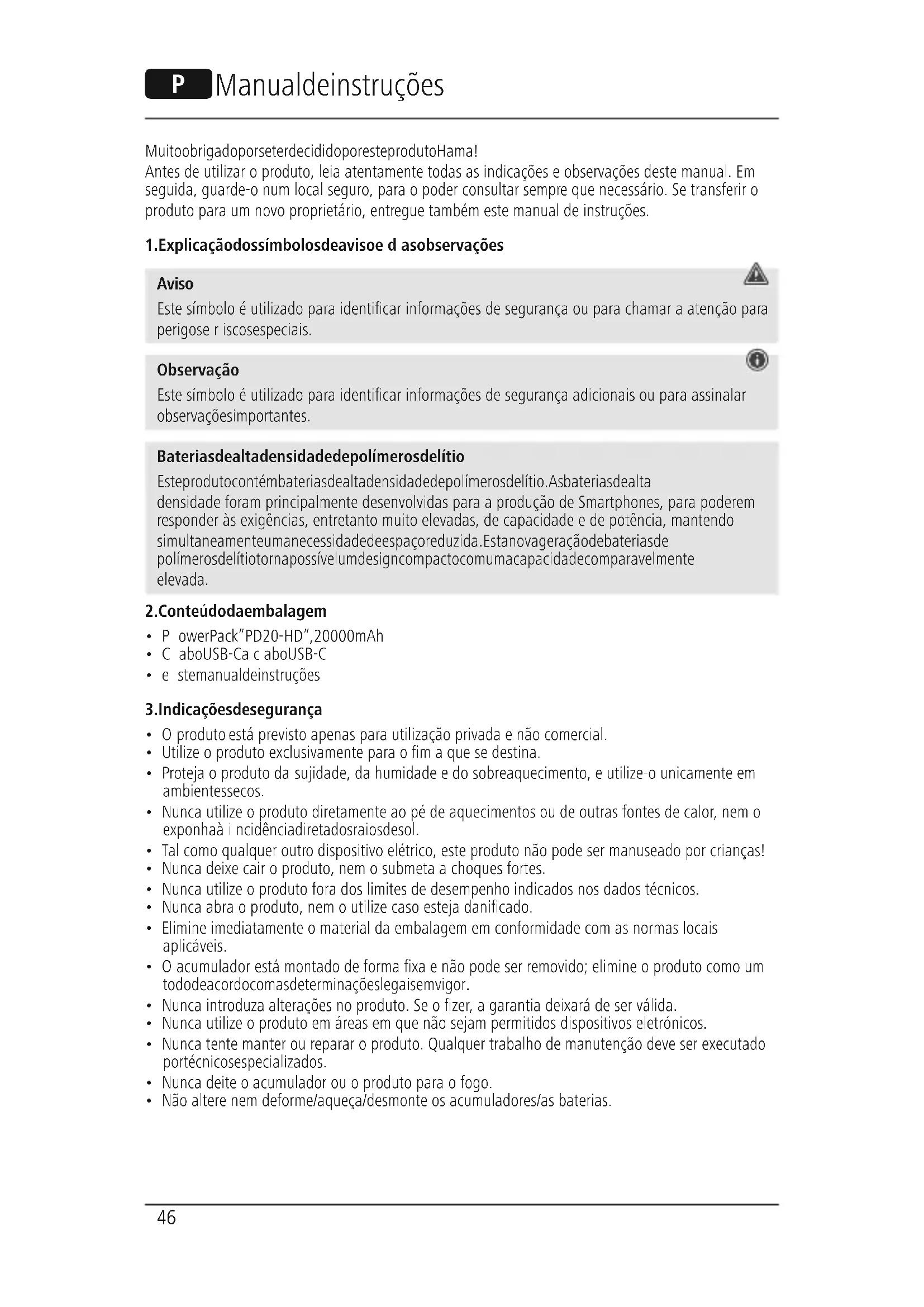 Aviso Este símbolo éutilizado paraidenticar informações de segurança ou parachamar aatenção para perigos eriscos especiais. Observação Este símbolo éutilizado paraidenticar informações de segurança adicionais ou paraassinalar observações importantes. Baterias de alta densidade de polímeros de lítio Este produto contém baterias de alta densidade de polímeros de lítio. As baterias de alta densidade foram principalmente desenvolvidas paraaprodução de Smartphones, parapoderem responder às exigências, entretanto muito elevadas, de capacidade edepotência, mantendo simultaneamente uma necessidade de espaço reduzida. Esta nova geração de baterias de polímeros de lítio torna possível um design compacto com uma capacidade comparavelmente elevada.