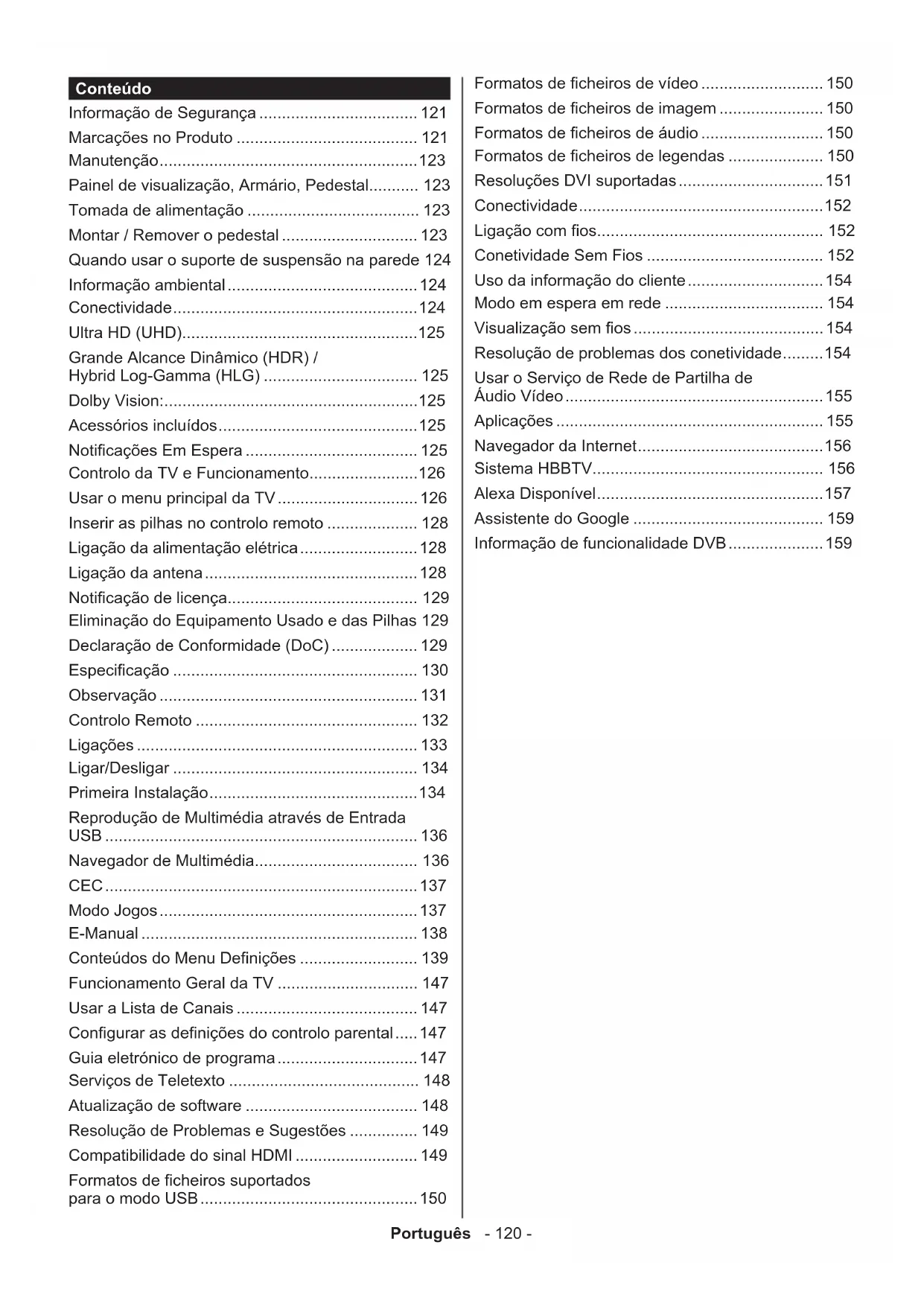 nel_name" on ‘FN’ A TV muda para o canal com o nome especicado channel up on ‘FN’ A TV muda para o canal imediatamente superior, se algum disponível channel down on ‘FN’ A TV muda para o canal imediatamente inferior, se algum disponível FN é a abreviatura para ‘Nome Amigável’. Google é uma marca comercial de Google LLC. Informação de funcionalidade DVB Este receptor DVB é apenas adequado para usar no país para o qual foi destinado a ser usado. Apesar deste receptor DVB estar conforme as últimas especificações DVB no momento da sua produção, não podemos garantir compatibilidade com futuras transmissões DBV devido a alterações que possam ser implementadas nos sinais de difusão e tecnologias. Algumas funções digitais da televisão podem não estar disponíveis em todos os países. Estamos comprometidos em melhorar os nossos produtos; portanto as especificações podem ser alteradas sem aviso prévio. Para aconselhamento sobre onde comprar acessórios, deve contactar o estabelecimento onde adquiriu o seu equipamento.