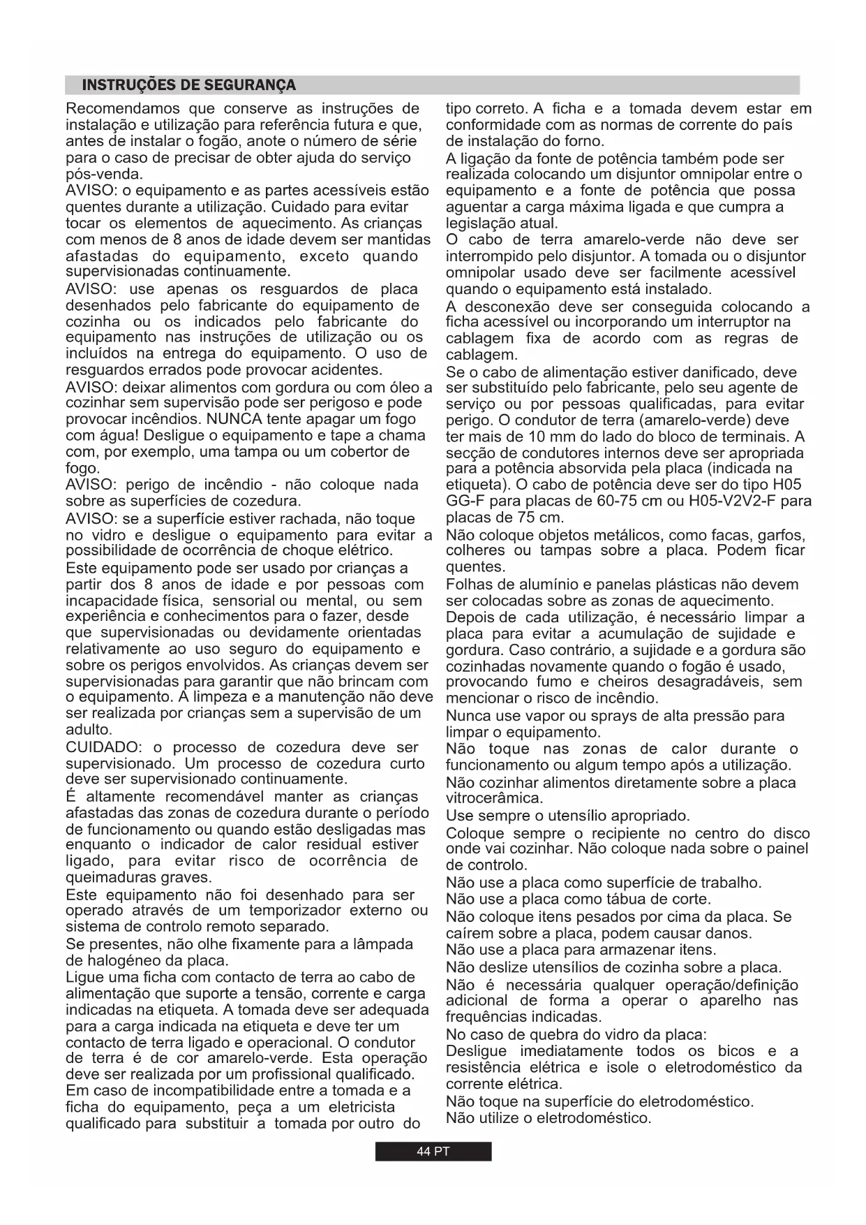 Iniezione elettrica sì sì sì sì sì sì Dimensione prodotto (mm) 595x505x42 595x505x42 595x505x42 595x505x42 745x505x42 745x505x4244 PT Ligue uma ficha com contacto de terra ao cabo de alimentação que suporte a tensão, corrente e carga indicadas na etiqueta. A tomada deve ser adequada para a carga indicada na etiqueta e deve ter um contacto de terra ligado e operacional. O condutor de terra é de cor amarelo-verde. Esta operação deve ser realizada por um profissional qualificado. Em caso de incompatibilidade entre a tomada e a ficha do equipamento, peça a um eletricista qualificado para substituir a tomada por outro do Se presentes, não olhe fixamente para a lâmpada de halogéneo da placa. Este equipamento não foi desenhado para ser operado através de um temporizador externo ou sistema de controlo remoto separado. AVISO: perigo de incêndio - não coloque nada sobre as superfícies de cozedura. Este equipamento pode ser usado por crianças a partir dos 8 anos de idade e por pessoas com incapacidade física, sensorial ou mental, ou sem experiência e conhecimentos para o fazer, desde que supervisionadas ou devidamente orientadas relativamente ao uso seguro do equipamento e sobre os perigos envolvidos. As crianças devem ser supervisionadas para garantir que não brincam com o equipamento. A limpeza e a manutenção não deve ser realizada por crianças sem a supervisão de um adulto. AVISO: se a superfície estiver rachada, não toque no vidro e desligue o equipamento para evitar a possibilidade de ocorrência de choque elétrico. AVISO: o equipamento e as partes acessíveis estão quentes durante a utilização. Cuidado para evitar tocar os elementos de aquecimento. As crianças com menos de 8 anos de idade devem ser mantidas afastadas do equipamento, exceto quando supervisionadas continuamente. AVISO: use apenas os resguardos de placa desenhados pelo fabricante do equipamento de cozinha ou os indicados pelo fabricante do equipamento nas instruções de utilização ou os incluídos na entrega do equipamento. O uso de resguardos errados pode provocar acidentes. AVISO: deixar alimentos com gordura ou com óleo a cozinhar sem supervisão pode ser perigoso e pode provocar incêndios. NUNCA tente apagar um fogo com água! Desligue o equipamento e tape a chama com, por exemplo, uma tampa ou um cobertor de fogo. CUIDADO: o processo de cozedura deve ser supervisionado. Um processo de cozedura curto deve ser supervisionado continuamente. É altamente recomendável manter as crianças afastadas das zonas de cozedura durante o período de funcionamento ou quando estão desligadas mas enquanto o indicador de calor residual estiver ligado, para evitar risco de ocorrência de queimaduras graves. Recomendamos que conserve as instruções de instalação e utilização para referência futura e que, antes de instalar o fogão, anote o número de série para o caso de precisar de obter ajuda do serviço pós-venda.