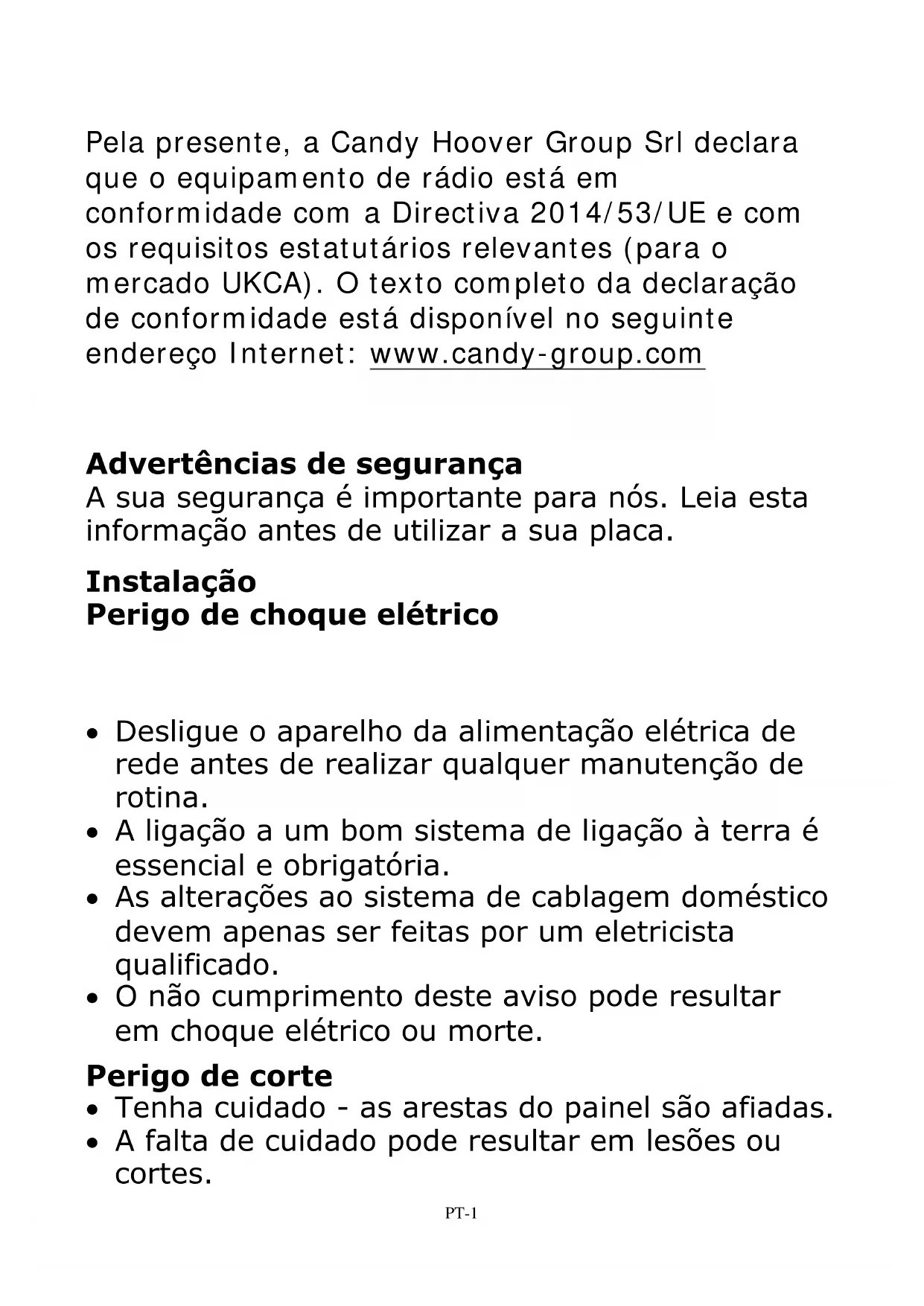 - A falta de cuidado pode resultar em lesões ou cortes. Advertências de segurança A sua segurança é importante para nós. Leia esta informação antes de utilizar a sua placa. Instalação Perigo de choque elétrico Pela presente, a Candy Hoover Group Srl declara que o equipamento de rádio está em conformidade com a Directiva 2014/53/UE e com os requisitos estatutários relevantes (para o mercado UKCA). O texto completo da declaração de conformidade está disponível no seguinte endereço Internet: www.candy-group.comPT-2 Instruções de segurança importantes