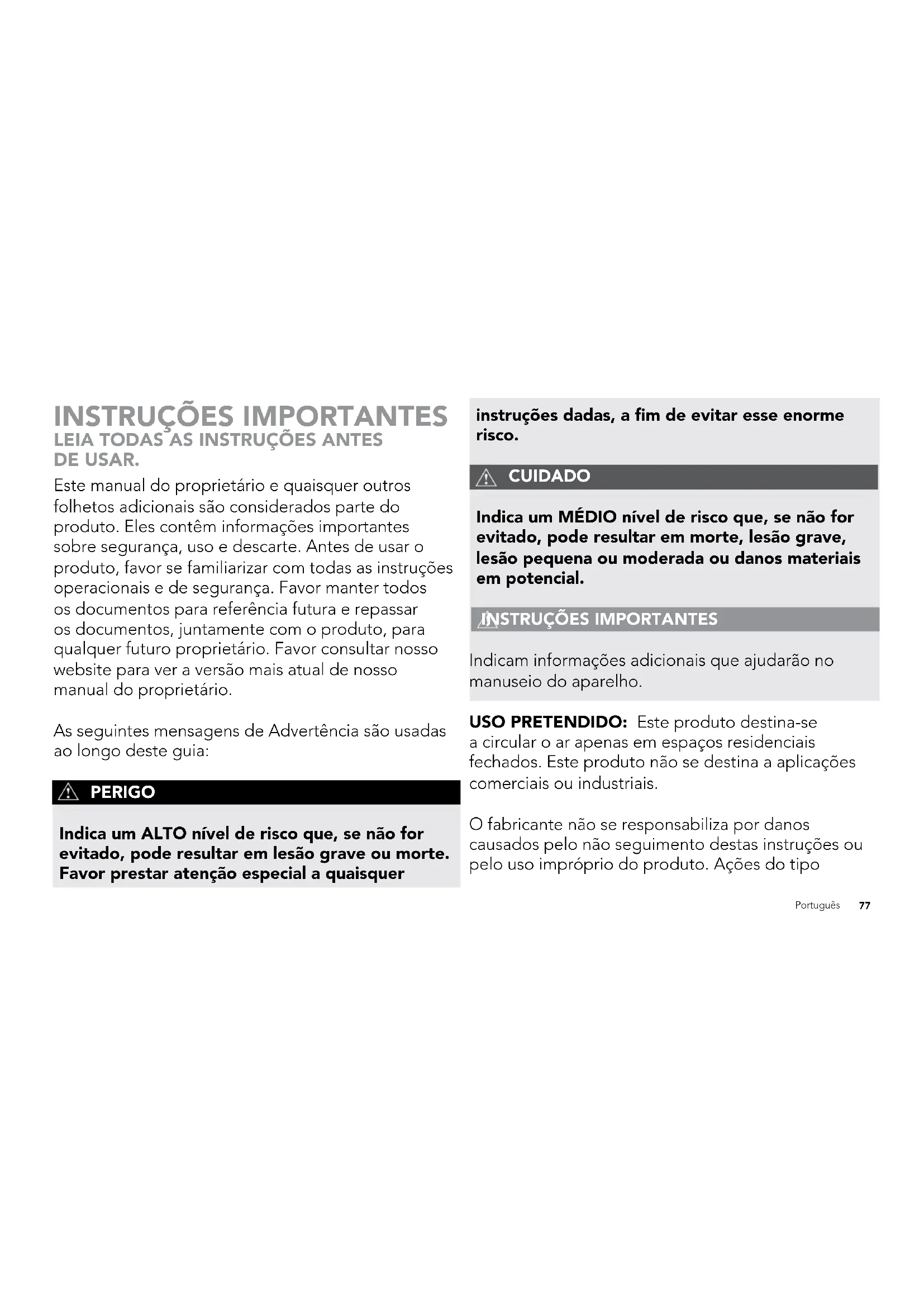 Indicam informações adicionais que ajudarão no manuseio do aparelho. USO PRETENDIDO: Este produto destina-se a circular o ar apenas em espaços residenciais fechados. Este produto não se destina a aplicações comerciais ou industriais. O fabricante não se responsabiliza por danos causados pelo não seguimento destas instruções ou pelo uso impróprio do produto. Ações do tipo