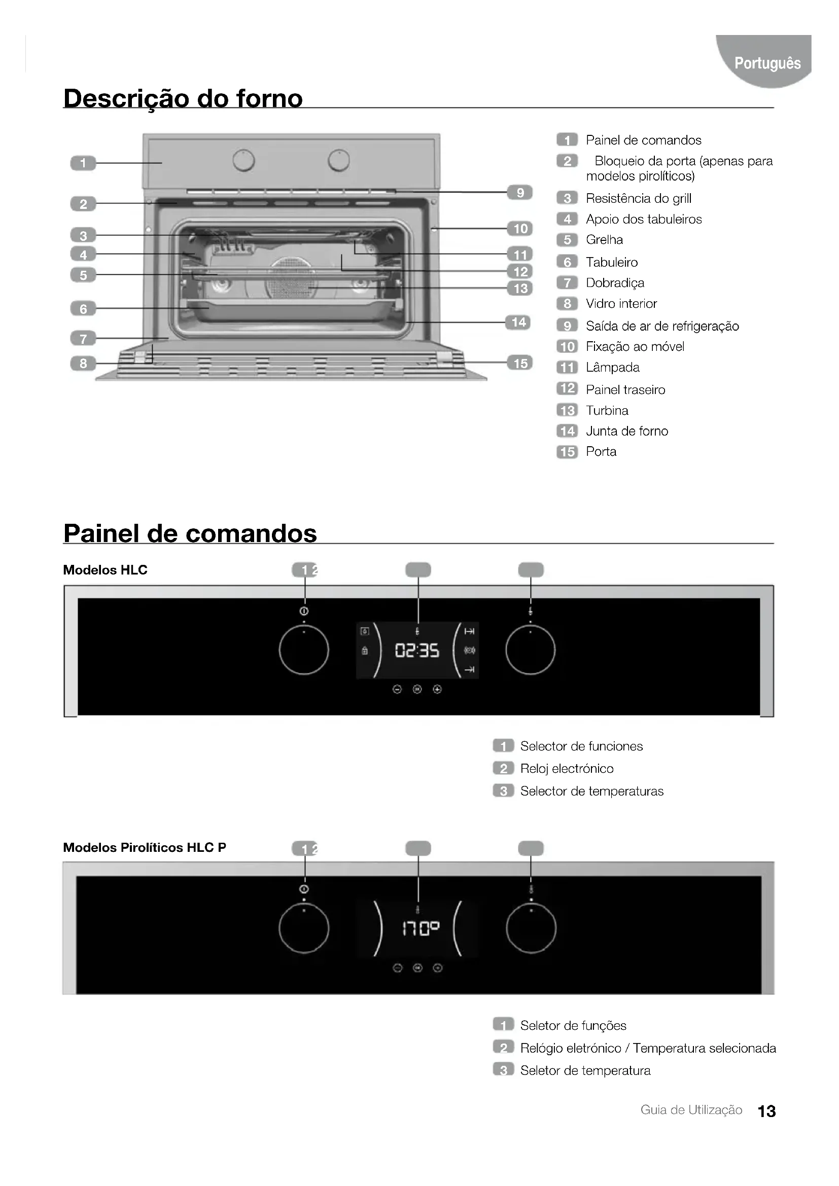for necessária uma limpeza mais profunda, utilize detergentes neutros e esponjas não abrasivas. Função de autolimpeza por pirólise Função disponível para os modelos piroliticos HLC P. ATENÇÃO Antes de realizar o ciclo de limpeza por pi- -rólise, leia atentamente as instruções de segurança disponibilizadas no início do ma- nual de Instalação e Manutenção. Esta função permite-lhe realizar um ciclo de limpeza por pirólise, durante o qual se produz um processo de carbonização das gorduras21 Guia de Utilização Português acumuladas, devido às elevadas temperaturas que são atingidas no interior do forno. Em geral, recomenda-se a realização de uma pirólise a cada 4 ou 5 cozinhados e a utilização do programa mais adequado ao nível de suji- dade do seu forno. Em caso de maior sujidade, escolha um programa de maior duração. Durante a pirólise, a iluminação do forno per- manecerá apagada. pRoGRaMaR a FUNÇÃo pIRólIsE IMpoRTaNTE Antes de realizar a pirólise é imprescindível retirar todos os acessórios e loiça do forno, incluindo os suportes de tabuleiros e/ou guias telescópicas. Para tal, siga as instruções pre- sentes no manual de instalação e manuten- ção fornecido com o forno. aTENÇÃo Retire qualquer vertido ou resto excessivo de sujidade, dado que durante o processo de pirólise poderia inflamar-se, correndo pe- rigo de incêndio. aTENÇÃo Antes de dar início ao programa de pirólise, certifique-se de que a porta do forno está devidamente fechada.
