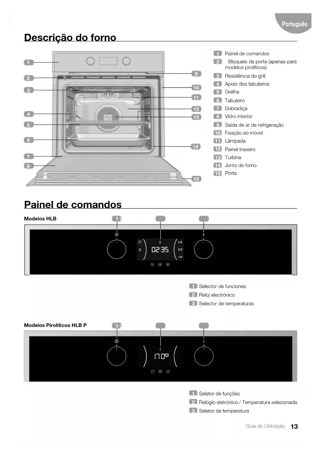 Modelos Pirolíticos HLB P14 Guia de Utilização Símbolos do seletor de funções Modelo HLB 830 Modelo HLB 840, HLB 850 Modelo HLB 830 P Modelo HLB 840 P Funções do forno INFORMAÇÃO Para uma descrição da utilização de cada uma das funções, consulte o guia de cozin- hados fornecido com o seu forno.