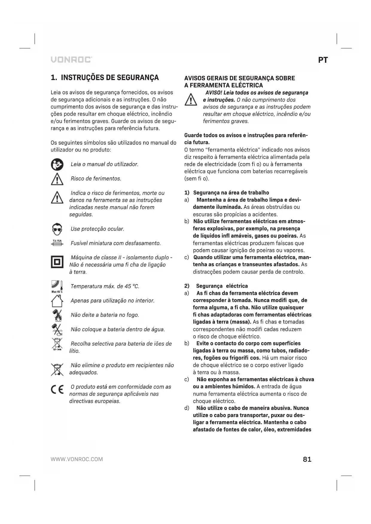 a) Não abra abateria. Perigo de curto-circuito. b) Proteja abateria do calor, por exemplo, contra exposição contínua aluz solar, fogo, água ehu- midade. Perigo de explosão. c) Em caso de danos euso inadequado da bateria, podem ser emitidos vapores. Ventile aárea econtacte um médico se houver queixas. Os vapores podem irritar osistema respiratório. d) Utilize abateria em conjunto com oseu produto industrial da Vonroc. Esta é aúnica protecção contra sobrecarga perigosa. e) Abateria pode ser perfurada por objectos da- nifi cados como pregos ou chaves de parafusos ou se for aplicada força externa. Pode ocorrer um curto-circuito interno eabateria pode quei- mar, causar fumo, explodir ou sobreaquecer.