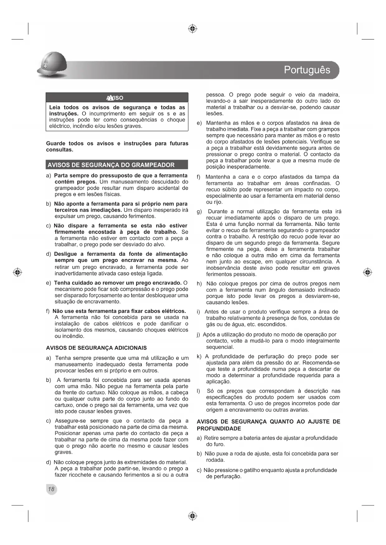 a) Tenha sempre presente que uma má utilização e um manuseamento inadequado desta ferramenta pode provocar lesões em si próprio e em outros. b) A ferramenta foi concebida para ser usada apenas com uma mão. Não pegue na ferramenta pela parte da frente do cartuxo. Não coloque as mãos, a cabeça ou qualquer outra parte do corpo junto ao fundo do cartuxo, onde o prego sai da ferramenta, uma vez que isto pode causar lesões graves. c) Assegure-se sempre que o contacto da peça a trabalhar está posicionado na parte de cima da mesma. Posicionar apenas uma parte do contacto da peça a trabalhar na parte de cima da mesma pode fazer com que o prego não acerte no mesmo e causar lesões graves. d) Não coloque pregos junto às extremidades do material. A peça a trabalhar pode partir-se, levando o prego a fazer ricochete e causando ferimentos a si ou a outra pessoa. O prego pode seguir o veio da madeira, levando-o a sair inesperadamente do outro lado do material a trabalhar ou a desviar-se, podendo causar lesões. e) Mantenha as mãos e o corpos afastados na área de trabalho imediata. Fixe a peça a trabalhar com grampos sempre que necessário para manter as mãos e o resto do corpo afastados de lesões potenciais. Verifique se a peça a trabalhar está devidamente segura antes de pressionar o prego contra o material. O contacto da peça a trabalhar pode levar a que a mesma mude de posição inesperadamente. f) Mantenha a cara e o corpo afastados da tampa da ferramenta ao trabalhar em áreas confinadas. O recuo súbito pode representar um impacto no corpo, especialmente ao usar a ferramenta em material denso ou rijo. g) Durante a normal utilização da ferramenta esta irá recuar imediatamente após o disparo de um prego. Esta é uma função normal da ferramenta. Não tente evitar o recuo da ferramenta segurando o grampeador contra o trabalho. A restrição do recuo pode levar ao disparo de um segundo prego da ferramenta. Segure firmemente na pega, deixe a ferramenta trabalhar e não coloque a outra mão em cima da ferramenta nem junto ao escape, em qualquer circunstância. A inobservância deste aviso pode resultar em graves ferimentos pessoais. h) Não coloque pregos por cima de outros pregos nem com a ferramenta num ângulo demasiado inclinado porque isto pode levar os pregos a desviarem-se, causando lesões.