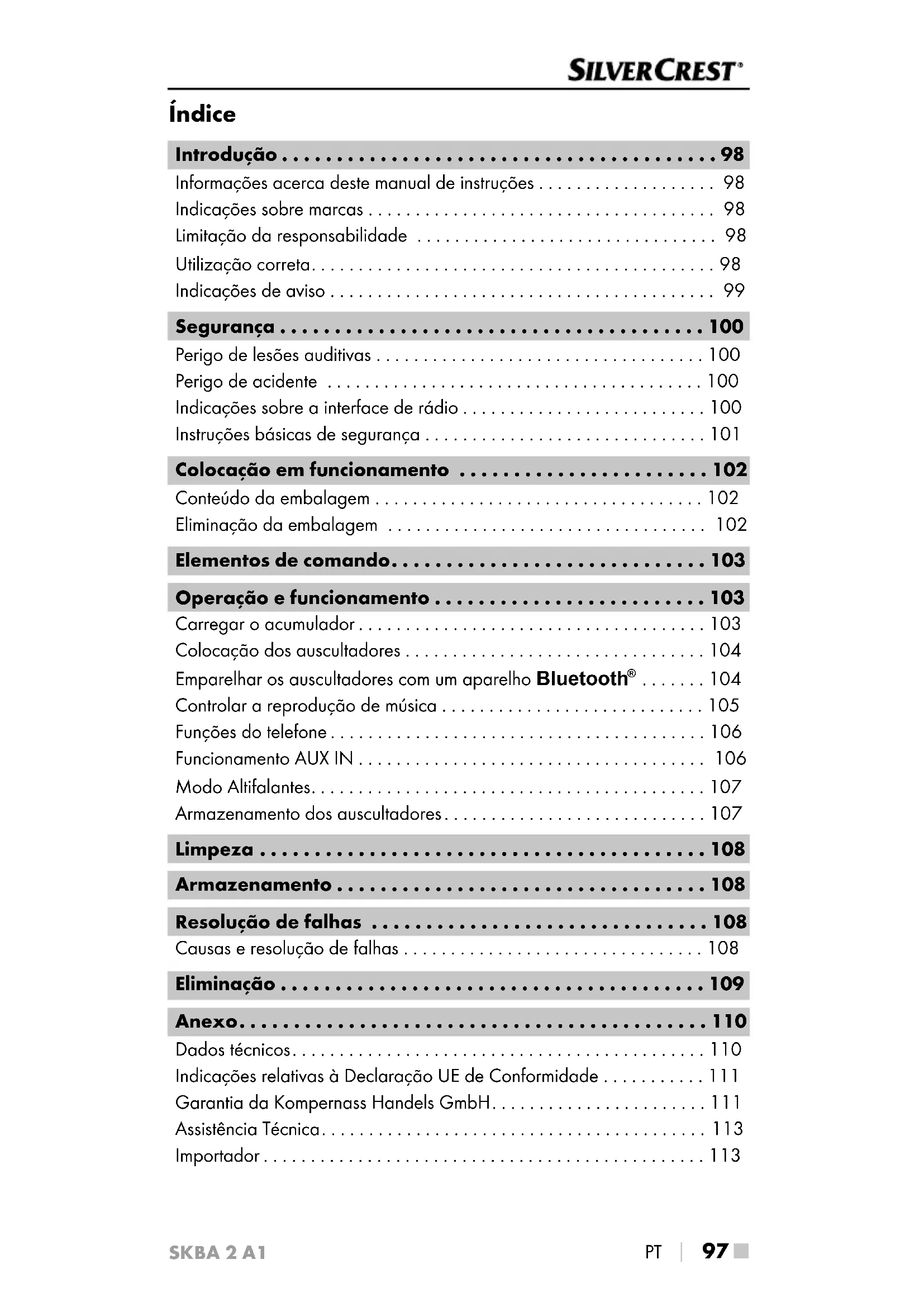 111 ■ Indicações relativas à Declaração UE de Conformidade Este aparelho encontra-se em conformidade com os requisitos fundamentais e outras disposições relevantes da Diretiva Equipamentos de Rádio 2014/53/EU e da Diretiva RSP 2011/65/EU. A Declaração UE de Conformidade integral poderá ser descarregada em www.kompernass.com/support/288242_DOC.pdf. Garantia da Kompernass Handels GmbH Estimada Cliente, Estimado Cliente, Este aparelho tem uma garantia de 3 anos a contar da data de compra. No caso deste produto ter defeitos, tem direitos legais contra o vendedor do produto. Estes direitos legais não são limitados pela nossa garantia que passamos a transcrever. Condições de garantia O prazo de garantia tem início na data da compra. Por favor, guarde bem o talão de compra original. Este documento é necessário como comprovativo da compra. Se dentro de três anos a partir da data de compra deste produto, ocorrer um defeito de material ou fabrico, o produto será reparado ou substituído por nós – consoante a nossa preferência – gratuitamente. Esta garantia parte do princípio que o aparelho defeituoso e o comprovativo da compra (talão de compra) são apresentados dentro do prazo de três anos e é des- crito brevemente, por escrito, em que consiste o defeito e quando ocorreu. Se o defeito estiver coberto pela nossa garantia, receberá o produto repara- do ou um novo produto. Prazo de garantia e direitos legais O período de garantia não é prolongado pelo acionamento da mesma. Isto também se aplica a peças substituídas e reparadas. Danos e defeitos que possam eventualmente já existir no momento da compra devem ser ime- diatamente comunicados, após retirar o aparelho da embalagem. Expirado o período da garantia, quaisquer reparações necessárias estão sujeitas a pagamento.SKBA 2 A1 ■ 112