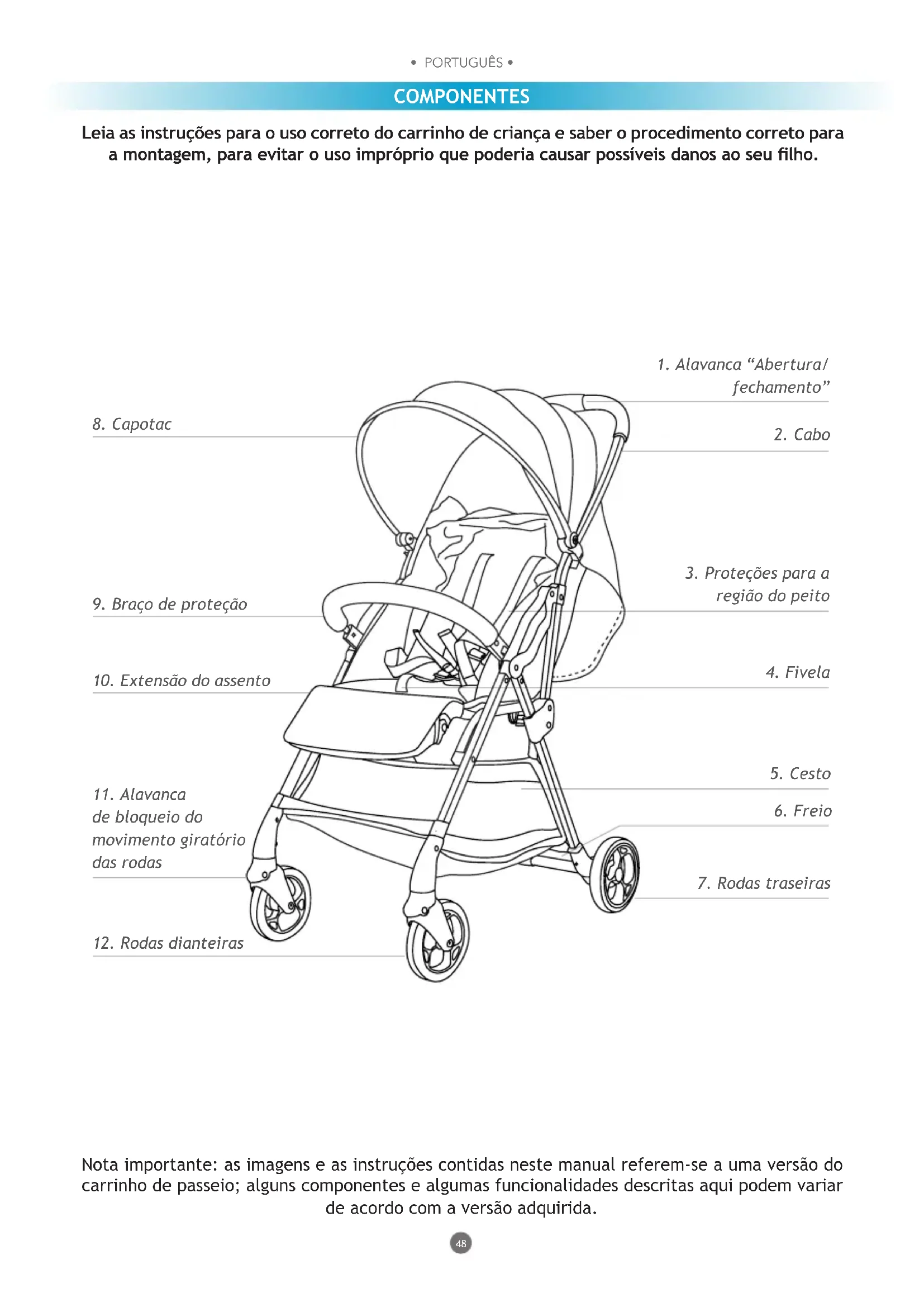 - PORTUGUÊS • • PORTUGUÊS • Leia as instruções para o uso correto do carrinho de criança e saber o procedimento correto para a montagem, para evitar o uso impróprio que poderia causar possíveis danos ao seu lho. COMPONENTES Nota importante: as imagens e as instruções contidas neste manual referem-se a uma versão do carrinho de passeio; alguns componentes e algumas funcionalidades descritas aqui podem variar de acordo com a versão adquirida.