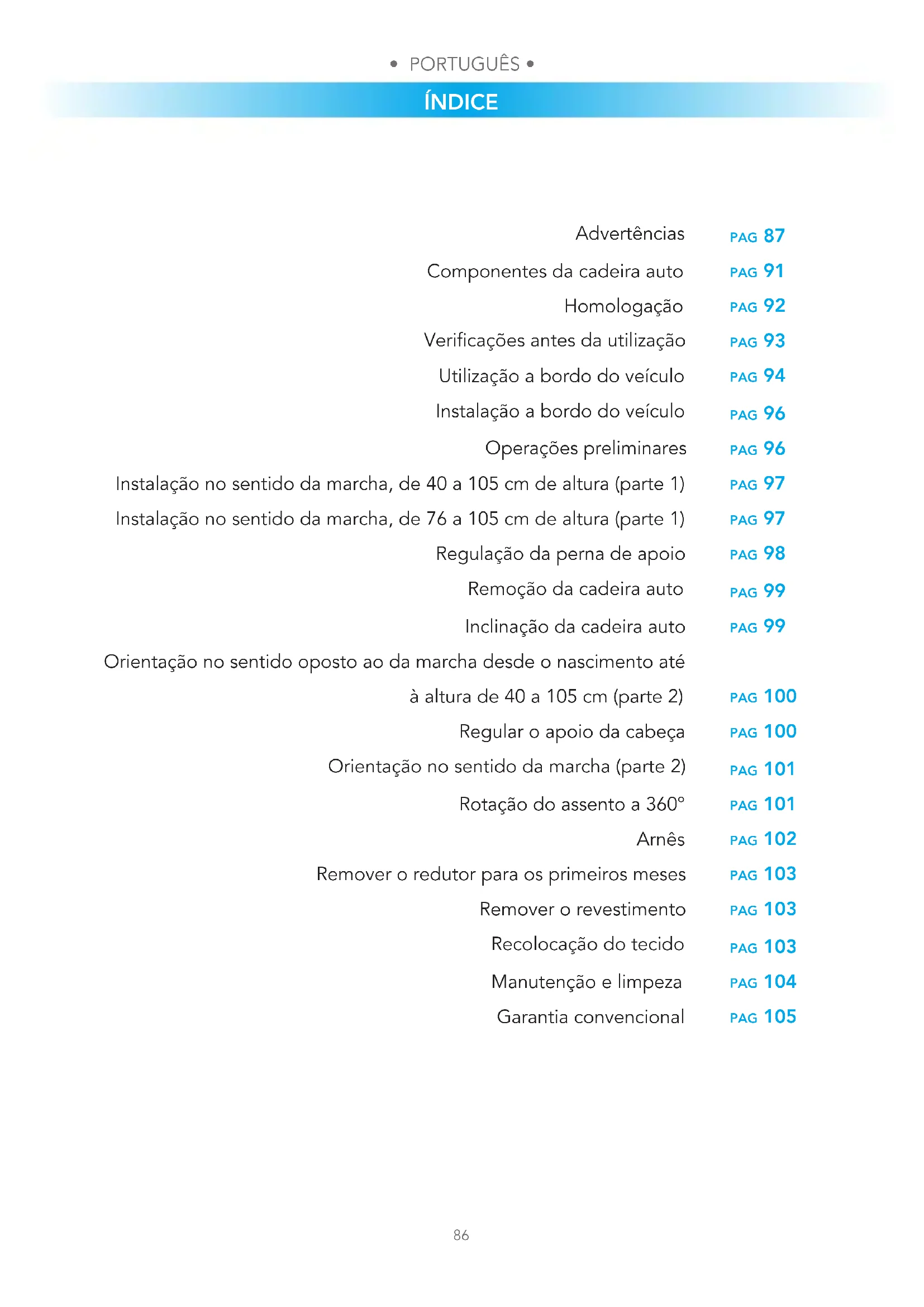pag 87 pag 91 pag 92 pag 93 pag 94 pag 96 pag 96 pag 97 pag 97 pag 98 pag 99 pag 99 pag 100 pag 100 pag 101 pag 101 pag 102 pag 103 pag 103 pag 103 pag 104 pag 105 Advertências Componentes da cadeira auto Homologação Vericações antes da utilização Utilização a bordo do veículo Instalação a bordo do veículo Operações preliminares Instalação no sentido da marcha, de 40 a 105 cm de altura (parte 1) Instalação no sentido da marcha, de 76 a 105 cm de altura (parte 1) Regulação da perna de apoio Remoção da cadeira auto Inclinação da cadeira auto Orientação no sentido oposto ao da marcha desde o nascimento até à altura de 40 a 105 cm (parte 2) Regular o apoio da cabeça Orientação no sentido da marcha (parte 2) Rotação do assento a 360º Arnês Remover o redutor para os primeiros meses Remover o revestimento Recolocação do tecido Manutenção e limpeza Garantia convencional• PORTUGUÊS •
