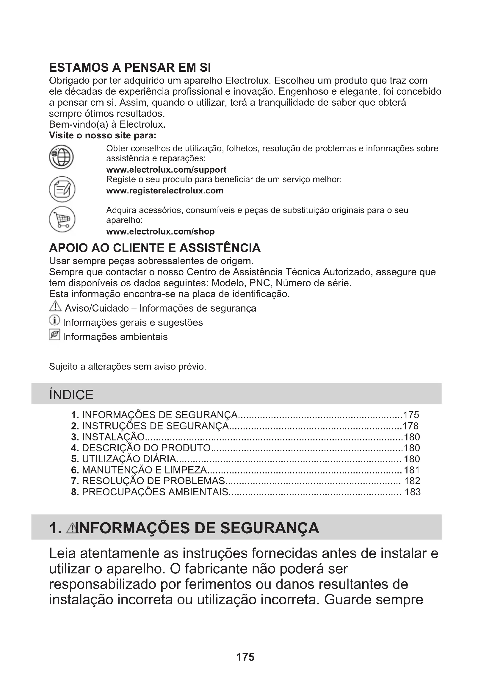 Obrigado por ter adquirido um aparelho Electrolux. Escolheu um produto que traz comele décadas de experiência profissional e inovação. Engenhoso e elegante, foi concebidoa pensar em si. Assim, quando o utilizar, terá a tranquilidade de saber que obterásempre ótimos resultados.Bem-vindo(a) à Electrolux.Visite o nosso site para:Obter conselhos de utilização, folhetos, resolução de problemas e informações sobreassistência e reparações:www.electrolux.com/supportRegiste o seu produto para beneficiar de um serviço melhor:www.registerelectrolux.comAdquira acessórios, consumíveis e peças de substituição originais para o seuaparelho:www.electrolux.com/shop