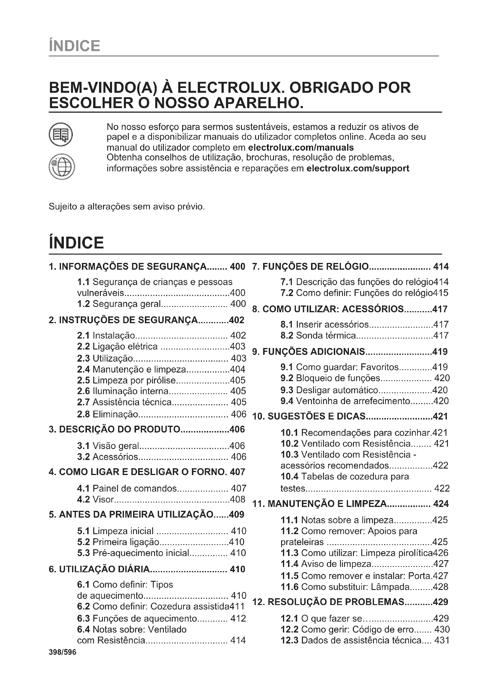 Recicle os materiais que apresentem o símbolo . Coloque a embalagem nos contentores indicados para reciclagem. Ajude a proteger o ambiente e a saúde pública através da reciclagem dos aparelhos eléctricos e electrónicos. Não elimine os aparelhos que tenham o símbolo juntamente com os resíduos domésticos. Coloque o produto num ponto de recolha para reciclagem local ou contacte as suas autoridades municipais. 437/596 UTILIZE UM ATALHO!BINE AŢI VENIT LA ELECTROLUX! VĂ MULȚUMIM PENTRU CĂ AȚI ALES PRODUSUL NOSTRU. În misiunea noastră de a fi sustenabili, reducem utilizarea hârtiei și oferim integral online manualele de utilizare. Accesați manualul complet al utilizatorului la electrolux.com/manuals Găsiți sfaturi privind utilizarea, broșuri, informații pentru depanare, service și reparații la electrolux.com/support Ne rezervãm dreptul asupra efectuãrii de modificãri. CUPRINS