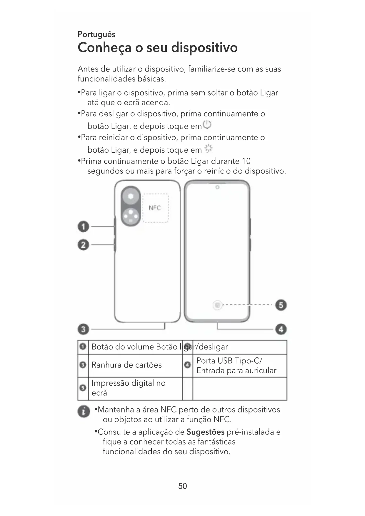 49Português Conheça o seu dispositivo Antes de utilizar o dispositivo, familiarize-se com as suas funcionalidades básicas.