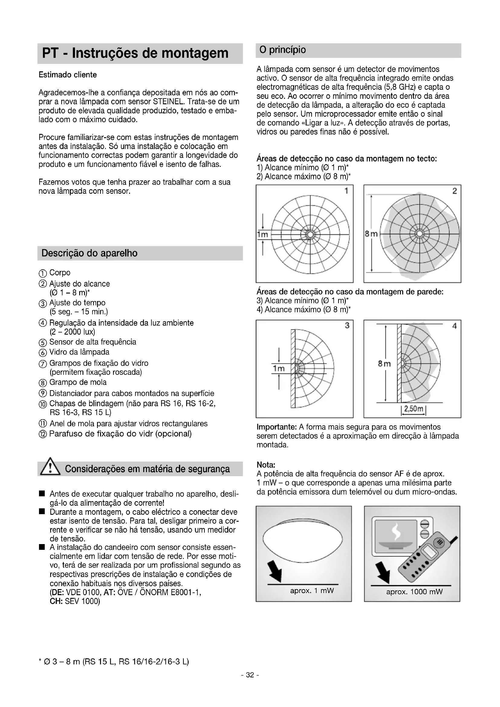 AÑOS DE FABRICANTE Serie RS_110077119_BDAL Serie RS_24spr_neu.qxp 09.11.21 12:42 Seite 32PT - Instruções de montagem Estimado cliente Agradecemos-lhe a confiança depositada em nós ao com- prar a nova lâmpada com sensor STEINEL. Trata-se de um produto de elevada qualidade produzido, testado e emba- lado com o máximo cuidado. Procure familiarizar-se com estas instruções de montagem antes da instalação. Só uma instalação e colocação em funcionamento correctas podem garantir a longevidade do produto e um funcionamento fiável e isento de falhas. Fazemos votos que tenha prazer ao trabalhar com a sua nova lâmpada com sensor. Descrição do aparelho
