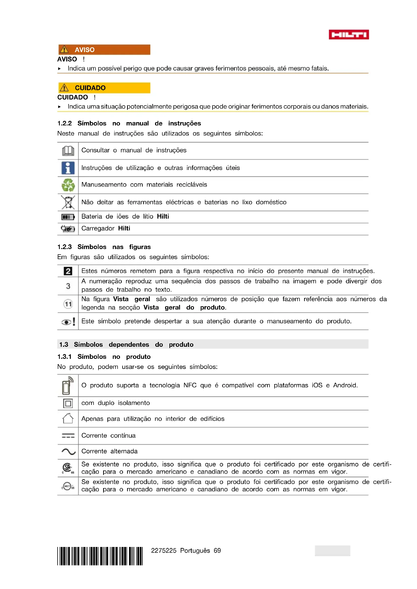 Neste manual de instruções são utilizados os seguintes símbolos: Consultar o manual de instruções Instruções de utilização e outras informações úteis Manuseamento com materiais recicláveis Não deitar as ferramentas eléctricas e baterias no lixo doméstico Bateria de iões de lítio Hilti Carregador Hilti