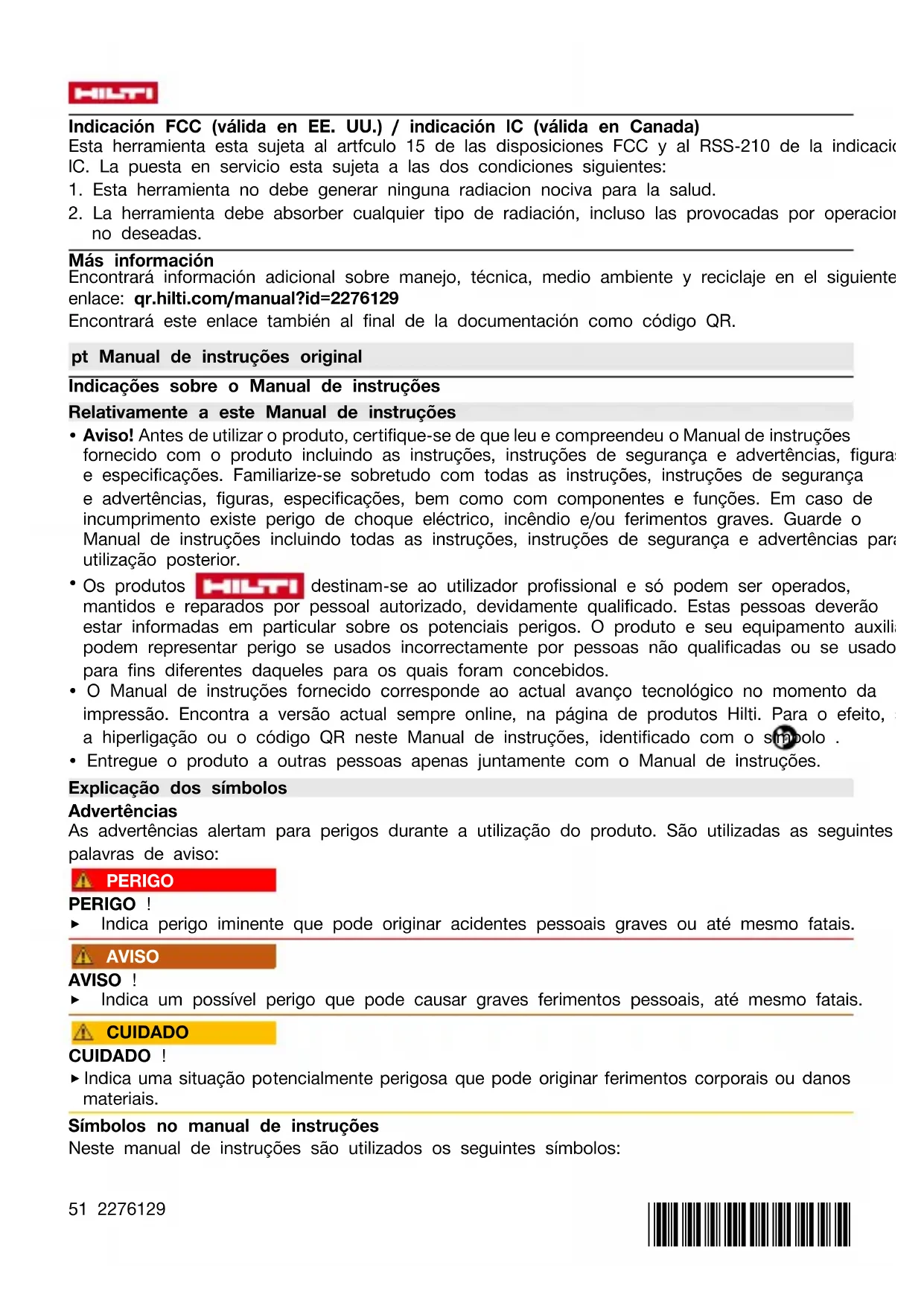 funcionamento indesejado. Mais informações Pode consultar informações mais pormenorizadas sobre Utilização, Tecnologia, Meio ambiente e Reciclagem na seguinte hiperligação: qr.hilti.com/manual?id=2276129 Também pode encontrar esta hiperligação no final da documentação sob a forma de código QR.69 2276129 *2276129*Hilti = registered trademark of Hilti Corp., Schaan Pos. 3 | 20240617 *2276129*