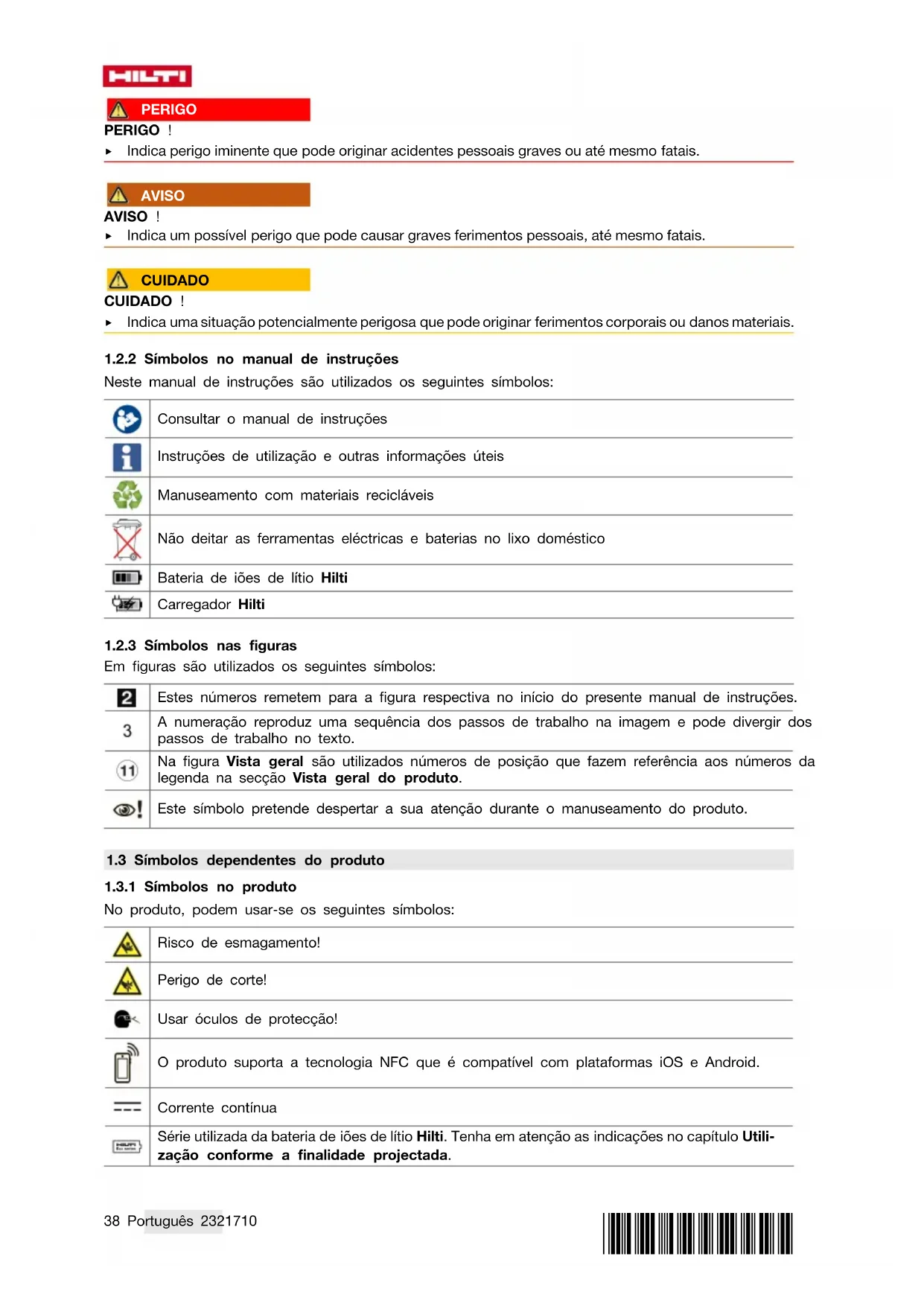 Neste manual de instruções são utilizados os seguintes símbolos: Consultar o manual de instruções Instruções de utilização e outras informações úteis Manuseamento com materiais recicláveis Não deitar as ferramentas eléctricas e baterias no lixo doméstico Bateria de iões de lítio Hilti Carregador Hilti