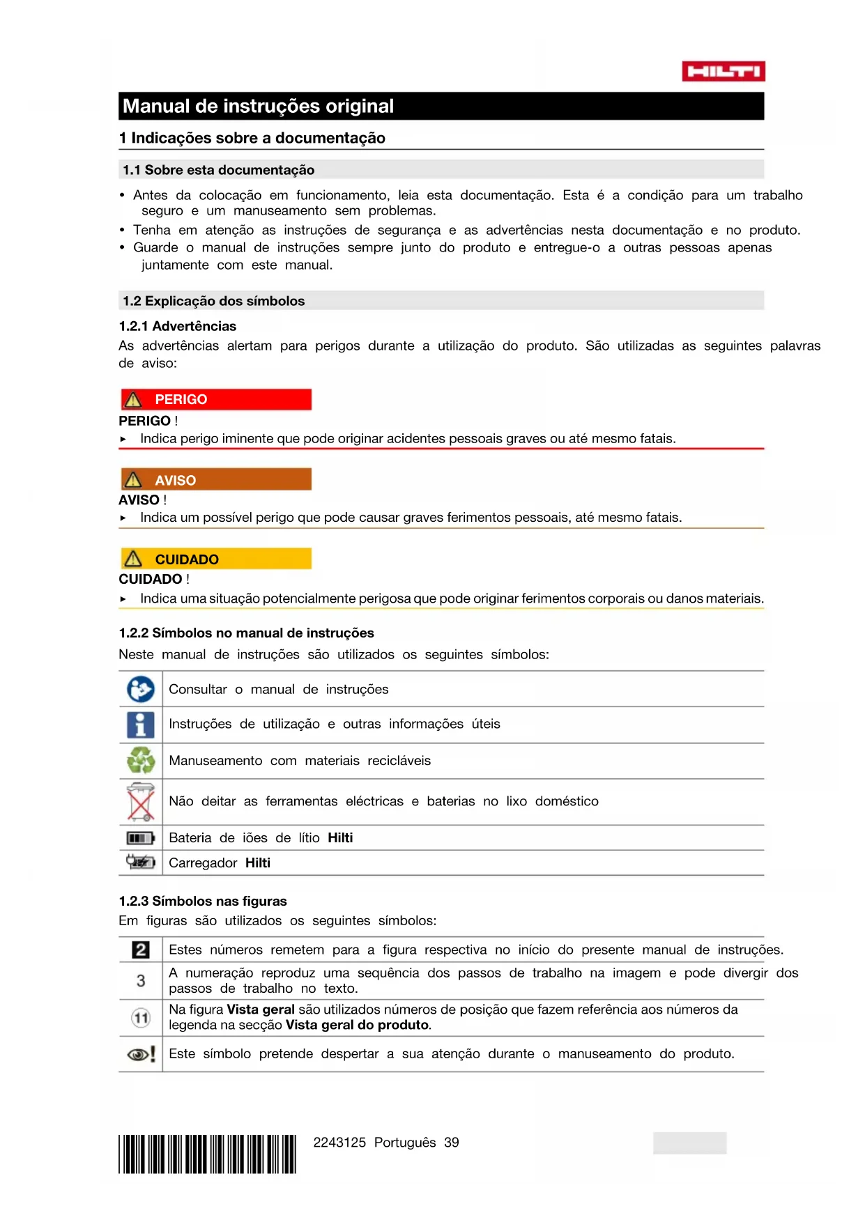 Neste manual de instruções são utilizados os seguintes símbolos: Consultar o manual de instruções Instruções de utilização e outras informações úteis Manuseamento com materiais recicláveis Não deitar as ferramentas eléctricas e baterias no lixo doméstico Bateria de iões de lítio Hilti Carregador Hilti