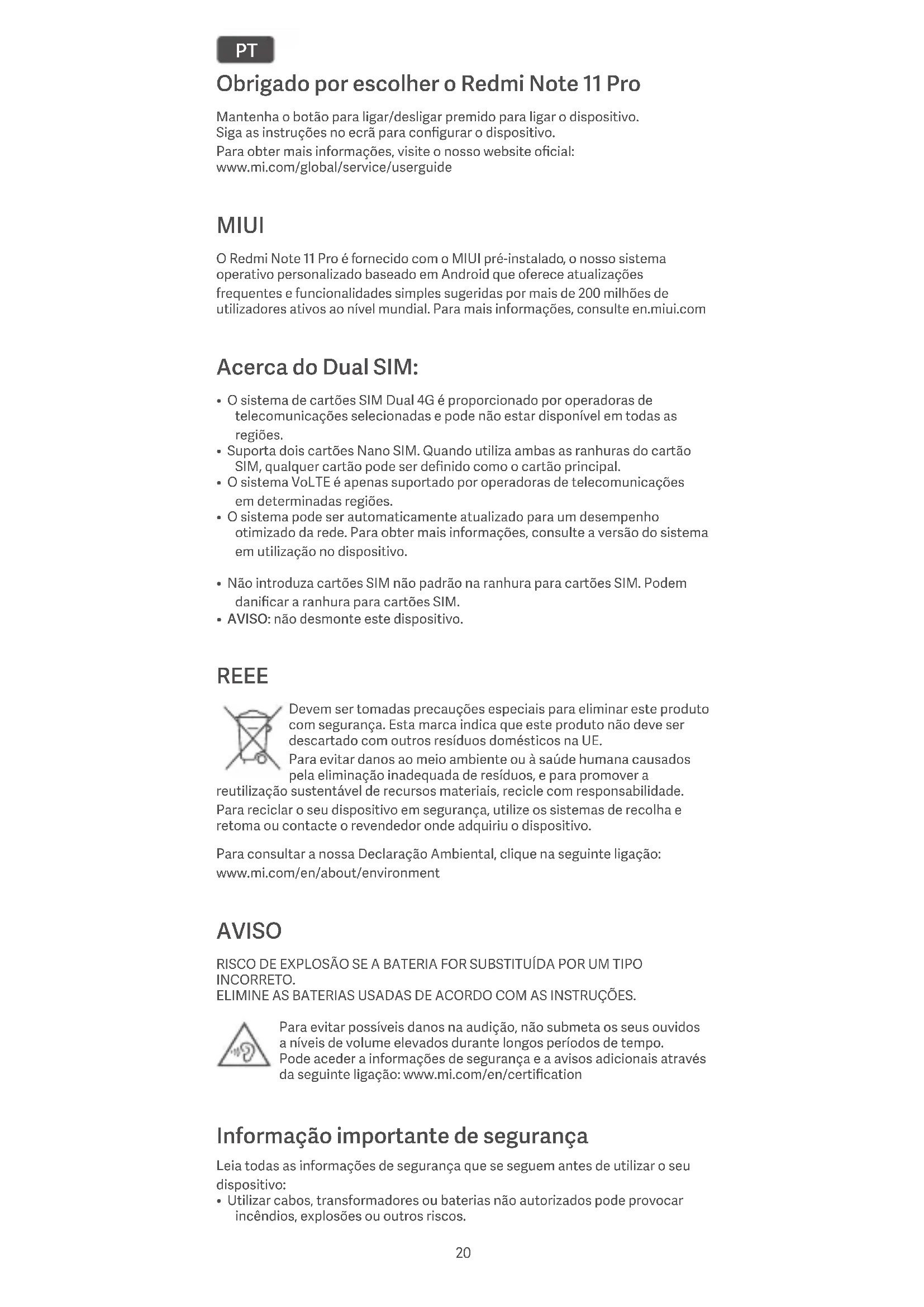 - AVISO: não desmonte este dispositivo. REEE Devem ser tomadas precauções especiais para eliminar este produto com segurança. Esta marca indica que este produto não deve ser descartado com outros resíduos domésticos na UE. Para evitar danos ao meio ambiente ou à saúde humana causados pela eliminação inadequada de resíduos, e para promover a reutilização sustentável de recursos materiais, recicle com responsabilidade. Para reciclar o seu dispositivo em segurança, utilize os sistemas de recolha e retoma ou contacte o revendedor onde adquiriu o dispositivo. Para consultar a nossa Declaração Ambiental, clique na seguinte ligação: www.mi.com/en/about/environment AVISO RISCO DE EXPLOSÃO SE A BATERIA FOR SUBSTITUÍDA POR UM TIPO INCORRETO. ELIMINE AS BATERIAS USADAS DE ACORDO COM AS INSTRUÇÕES. Para evitar possíveis danos na audição, não submeta os seus ouvidos a níveis de volume elevados durante longos períodos de tempo. Pode aceder a informações de segurança e a avisos adicionais através da seguinte ligação: www.mi.com/en/certification Informação importante de segurança Leia todas as informações de segurança que se seguem antes de utilizar o seu dispositivo: