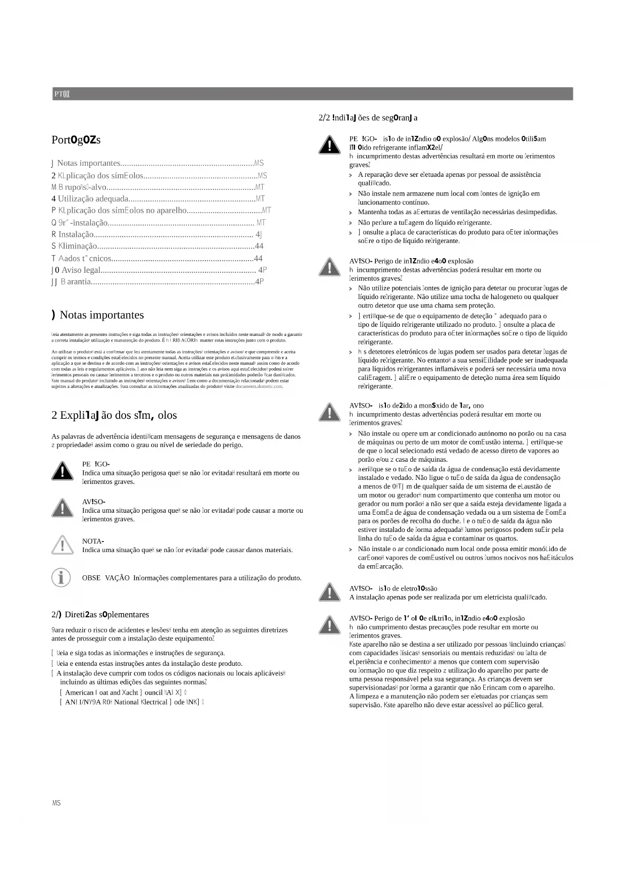 - El motivo de la reclamación o una descripción de la avería Tenga en cuenta que una reparación por medios propios o no profesionales puede tener consecuencias de seguridad y suponer la anulación de la garantía. 37PT Português 1 Notas importantes..............................................................38 2 Explicação dos símbolos.....................................................38 3 Grupo(s)-alvo.....................................................................39 4 Utilização adequada...........................................................39 5 Explicação dos símbolos no aparelho...................................39 6 Pré-instalação.................................................................... 39 7 Instalação.......................................................................... 41 8 Eliminação.........................................................................44 9 Dados técnicos..................................................................44 10 Aviso legal........................................................................ 45 11 Garantia............................................................................45 1 Notas importantes Leia atentamente as presentes instruções e siga todas as instruções, orientações e avisos incluídos neste manual, de modo a garantir a correta instalação, utilização e manutenção do produto. É OBRIGATÓRIO manter estas instruções junto com o produto. Ao utilizar o produto, está a confirmar que leu atentamente todas as instruções, orientações e avisos, e que compreende e aceita cumprir os termos e condições estabelecidos no presente manual. Aceita utilizar este produto exclusivamente para o fim e a aplicação a que se destina e de acordo com as instruções, orientações e avisos estabelecidos neste manual, assim como de acordo com todas as leis e regulamentos aplicáveis. Caso não leia nem siga as instruções e os avisos aqui estabelecidos, poderá sofrer ferimentos pessoais ou causar ferimentos a terceiros e o produto ou outros materiais nas proximidades poderão ficar danificados. Este manual do produto, incluindo as instruções, orientações e avisos, bem como a documentação relacionada, podem estar sujeitos a alterações e atualizações. Para consultar as informações atualizadas do produto, visite documents.dometic.com. 2 Explicação dos símbolos As palavras de advertência identificam mensagens de segurança e mensagens de danos à propriedade, assim como o grau ou nível de seriedade do perigo. PERIGO! Indica uma situação perigosa que, se não for evitada, resultará em morte ou ferimentos graves. AVISO! Indica uma situação perigosa que, se não for evitada, pode causar a morte ou ferimentos graves. NOTA! Indica uma situação que, se não for evitada, pode causar danos materiais. OBSERVAÇÃO Informações complementares para a utilização do produto.