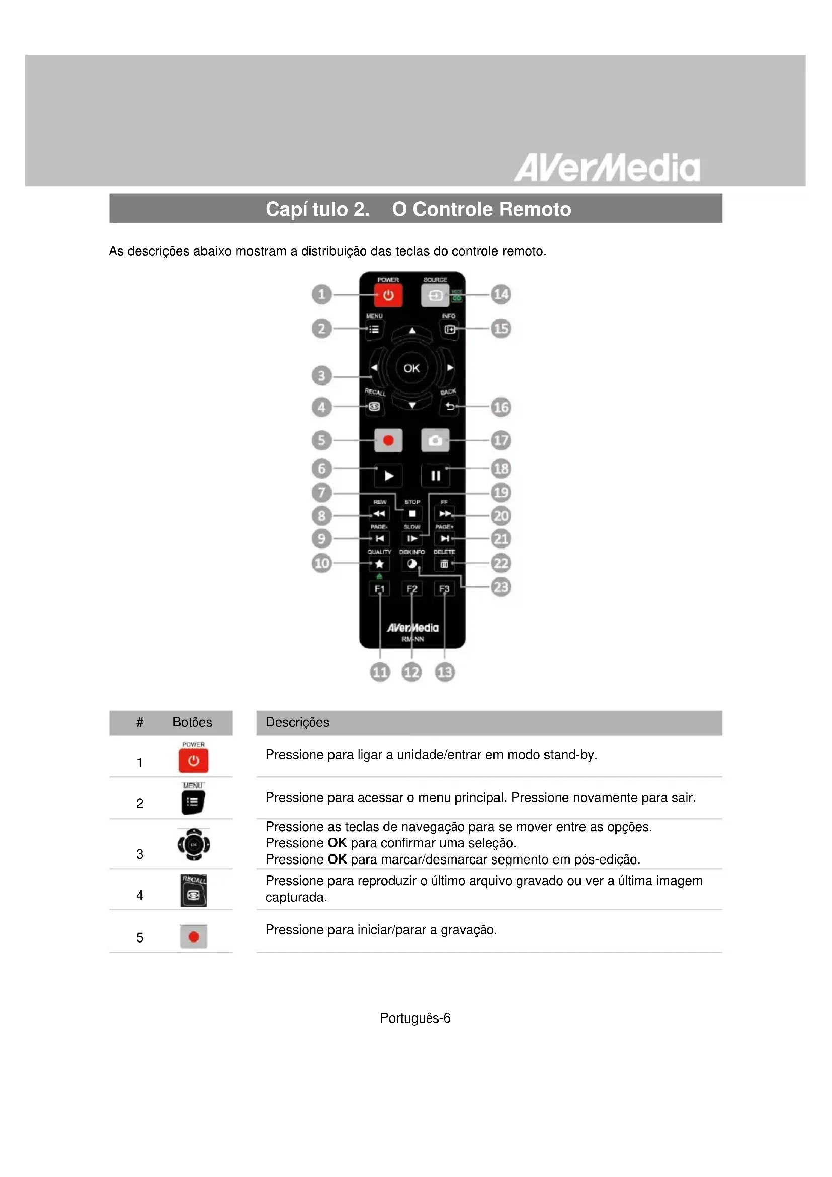 Quando utilizando o controle remoto, mirar o sensor infravermelho (IR) localizado no painel frontal da unidade. O controle remoto deve ser mantido em um ângulo dentro de 30 graus perpendicular ao sensor IR para funcionar corretamente. A distância entre o controle remoto e o sensor não deve exceder 6 metros (20 pés). PortuguêsPortuguês-6 Capítulo 2. O Controle Remoto As descrições abaixo mostram a distribuição das teclas do controle remoto.