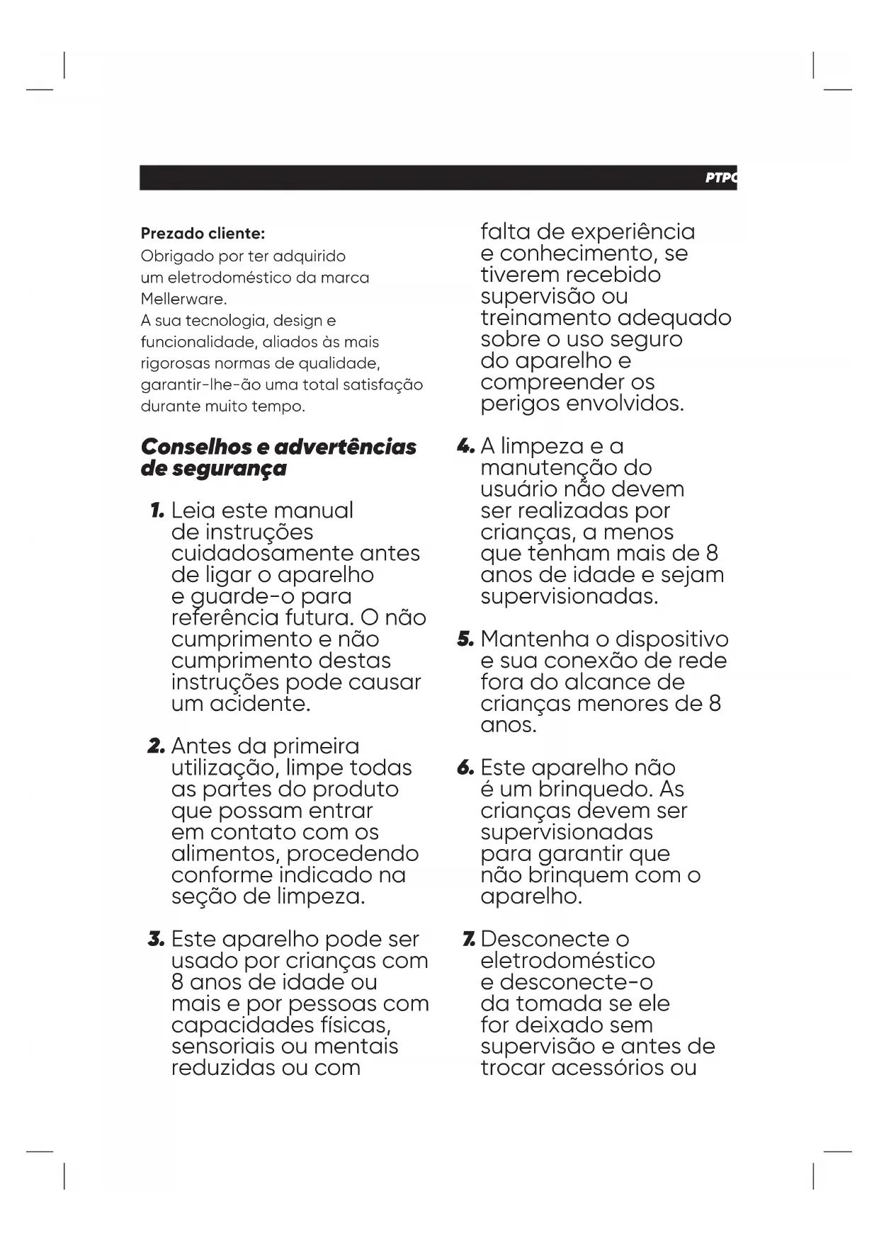 Os materiais que constituem a embalagem deste aparelho estão integrados num sistema de recolha, classi cação e reciclagem. Se desejar eliminá-los, utilize os contentores de reciclagem colocados à disposição para cada tipo de material. O produto está isento de concentrações de substâncias que possam ser consideradas nocivas para o ambiente. - Este símbolo signi ca que se desejar desfazer-se do produto depois de terminada a sua vida útil, deve entregá- lo através dos meios adequados ao cuidado de um gestor de resíduos autorizado para a recolha seletiva de Resíduos de Equipamentos Elétricos e Eletrônicos (REEE). Este aparelho cumpre a Diretiva 2014/35/CE de Baixa Tensão, a Diretiva 2014/30/ UE de Compatibilidade Eletromagnética a Diretiva 2011/65/ UE sobre restrições à utilização de determinadas substâncias perigosas em aparelhos elétricos e eletrônicos e a Diretiva 2009/125/ CE sobre os requisitos de design ecológico aplicável aos produtos relacionados com a energia. Garantia e assistência técnica Este produto possui reconhecimento e proteção da garantia legal em conformidade com a legislação em vigor. Para fazer valer os seus direitos ou interesses, deve recorrer sempre aos nossos serviços de assistência técnica o ciais. Poderá encontrar o mais próximo de si através do seguinte website: www.mellerware.com Pode também solicitar informação relacionada contactando-nos para o número de telefone que aparece no nal deste manual. Pode fazer o download deste manual de instruções e suas atualizações em www.mellerware.com