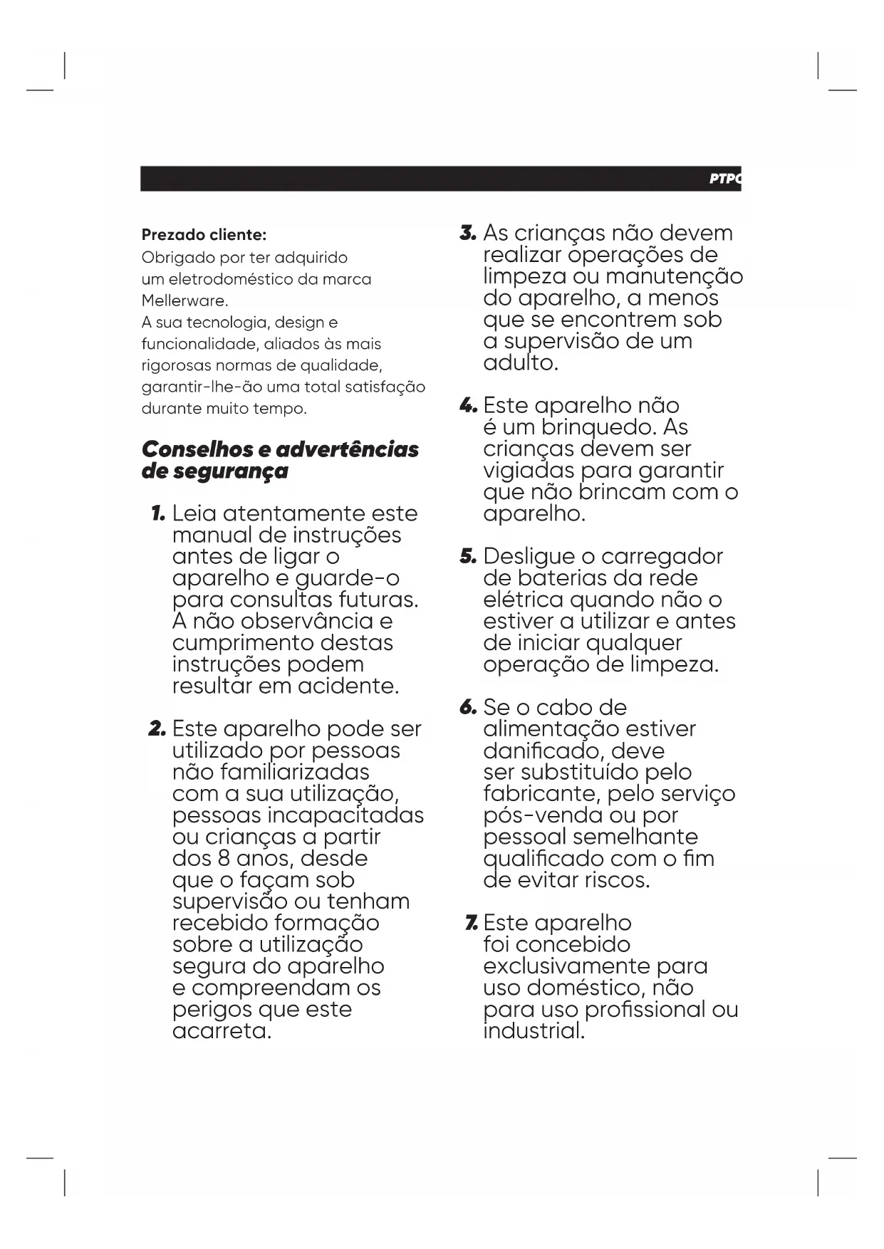 PRODUTO Os materiais que constituem a embalagem deste aparelho estão integrados num sistema de recolha, classi cação e reciclagem. Se desejar eliminá- los, utilize os contentores de reciclagem colocados à disposição para cada tipo de material. O produto está isento de concentrações de substâncias que possam ser consideradas nocivas para o ambiente. - Este símbolo signi ca que se desejar desfazer- se do produto depois de terminada a sua vida útil, deve entregá-lo através dos meios adequados ao cuidado de um gestor de resíduos autorizado para a recolha seletiva de Resíduos de Equipamentos Elétricose Eletrónicos (REEE). Este aparelho cumpre a Diretiva 2014/35/EU de Baixa Tensão, a Diretiva 2014/30/EU de Compatibilidade Eletromagnética, a Diretiva 2011/65/EU sobre restriçõessobre restrições à utilização de determinadas substâncias perigosas em aparelhos elétricos e eletrónicos e a Diretiva 2009/125/CE sobre os requisitos de design ecológico aplicável aos produtos relacionados com a energia. Garantia e assistência técnica Este produto possui reconhecimento e proteção da garantia legal em conformidade com a legislação em vigor. Para fazer valer os seus direitos ou interesses, deve recorrer sempre aos nossos serviços de assistência técnica o ciais. Poderá encontrar o mais próximo de si através do seguinte website: www.mellerware.com Pode também solicitar informação relacionada contactando-nos para o número de telefone que aparece no nal deste manual. Pode fazer o download deste manual de instruções e suas atualizações em www.mellerware.com